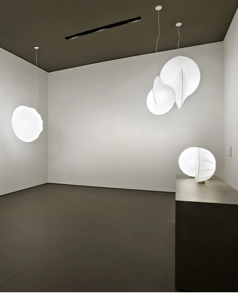 Lampa wisząca Overlap jest niezwykle fantazyjnym, ale też eleganckim projektem oświetleniowym. Dwa nachodzące na siebie, stalowe koła, na których rozpięty został naturalny, natryskiwany na stelaż, włóknisty materiał (kokon), tworzą świetlną iluminację przypominającą nietypowe ciało niebieskie lub dryfującego w oceanicznych wodach łodzika. Prosta, ale nie pozbawiona nuty ekstrawagancji forma nada szyku pomieszczeniom zarówno w stylu nowoczesnym, jak i klasycznym. Lampa wisząca Overlap odnajdzie się zarówno w salonie, jadalni, jak i w innych większych przestrzeniach jednocześnie je doświetlając i dekorując.