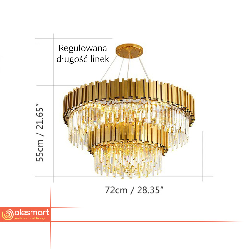 Decydując się na oświetlenie glamour, można zyskać zarówno godne uwagi rozwiązanie, które zapewni odpowiednie światło w pomieszczeniu, ale również i godną uwagi propozycję, która wypełni przestrzeń elementem dekoracyjnym. Ten kryształowy żyrandol Gladius, jest tego doskonałym przykładem. Złota konstrukcja, a do tego kryształowe, mieniące się elementy zwisające, wyglądają naprawdę fenomenalnie. Fenomenem tego żyrandola jest to, iż stanowi on produkt w pełni uniwersalny, a więc sprawdzi się zarówno w przestrzeni salonu, w jadalni, w kuchni, ale również i w luksusowym hotelu czy w ponadczasowo urządzonej restauracji. Jeśli więc idealne oświetlenie, to jak najbardziej ta propozycja, w iście nowojorskim stylu, okaże się być wyśmienitym wyborem.