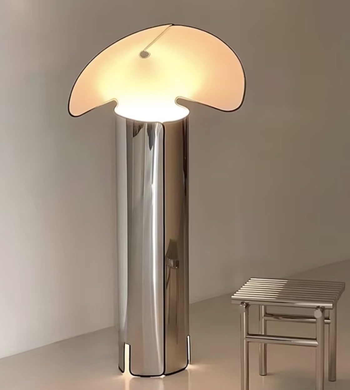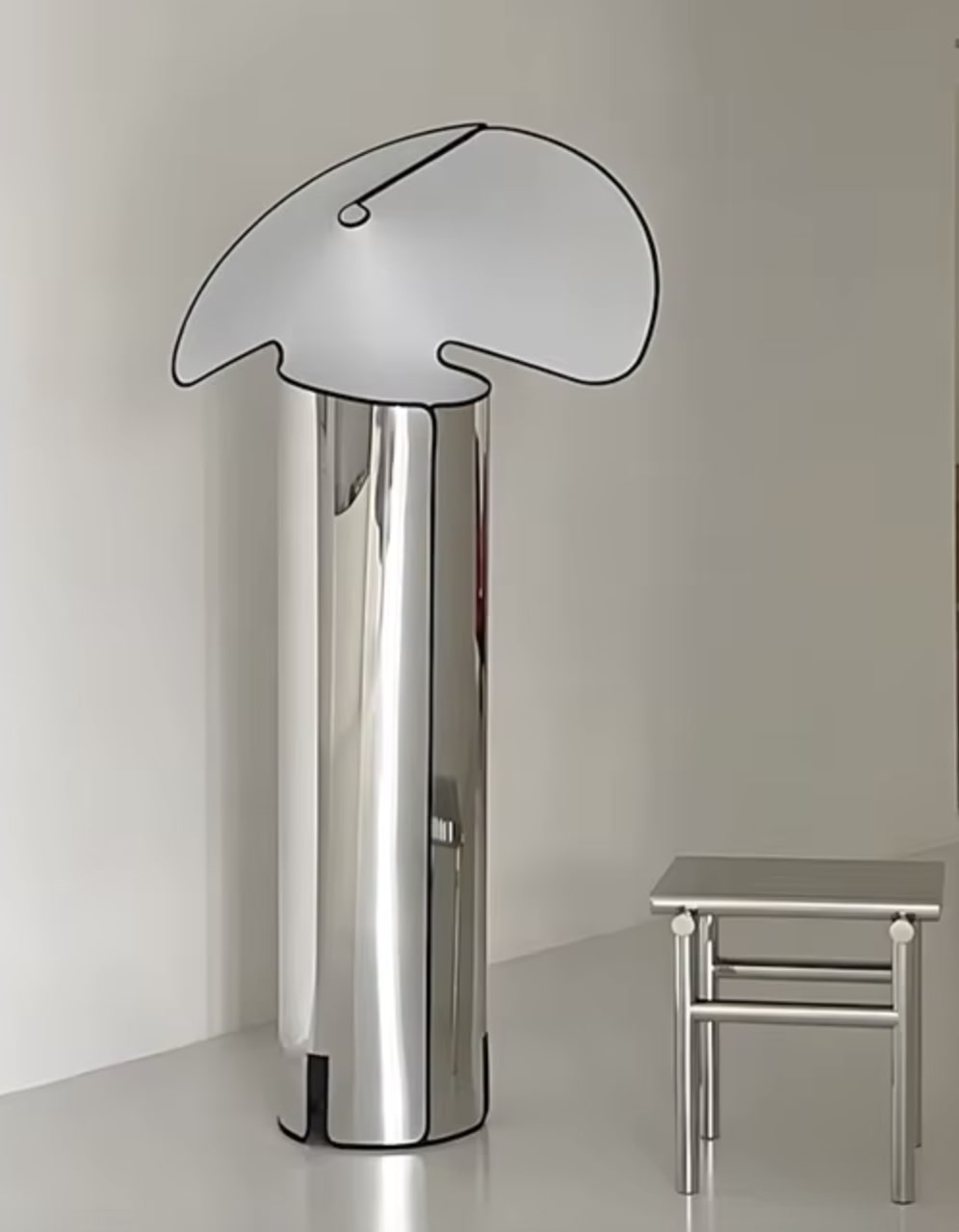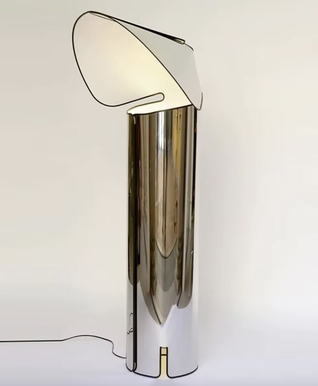 Lampa łączy miękki, organiczny kształt klosza z twardą, industrialną powierzchnią metalu. Wysoka, połyskująca kolumna zestawiona z organicznym kloszem, nadaje pomieszczeniu charakter nowoczesnej elegancji i luksusu. Pełni równocześnie funkcję oświetlenia i wyjątkowego elementu dekoracyjnego, przypominającego rzeźbę. Przeznaczona bardziej do nastrojowego oświetlenia, niż do typowego oświetlania miejsca pracy.