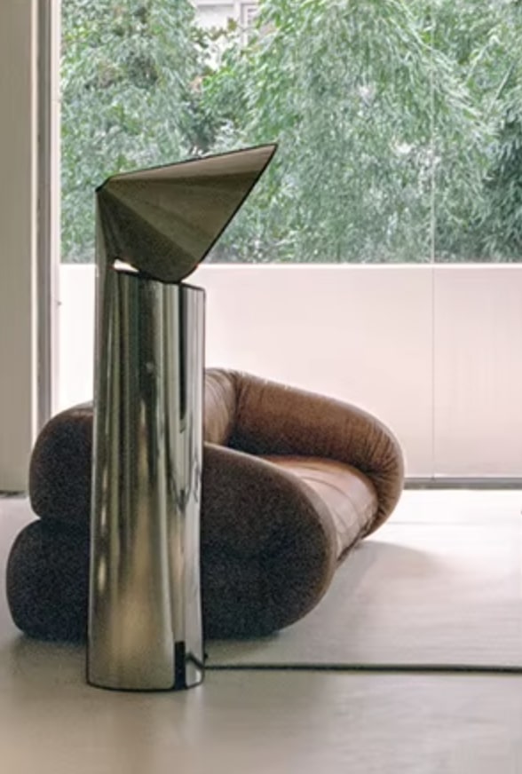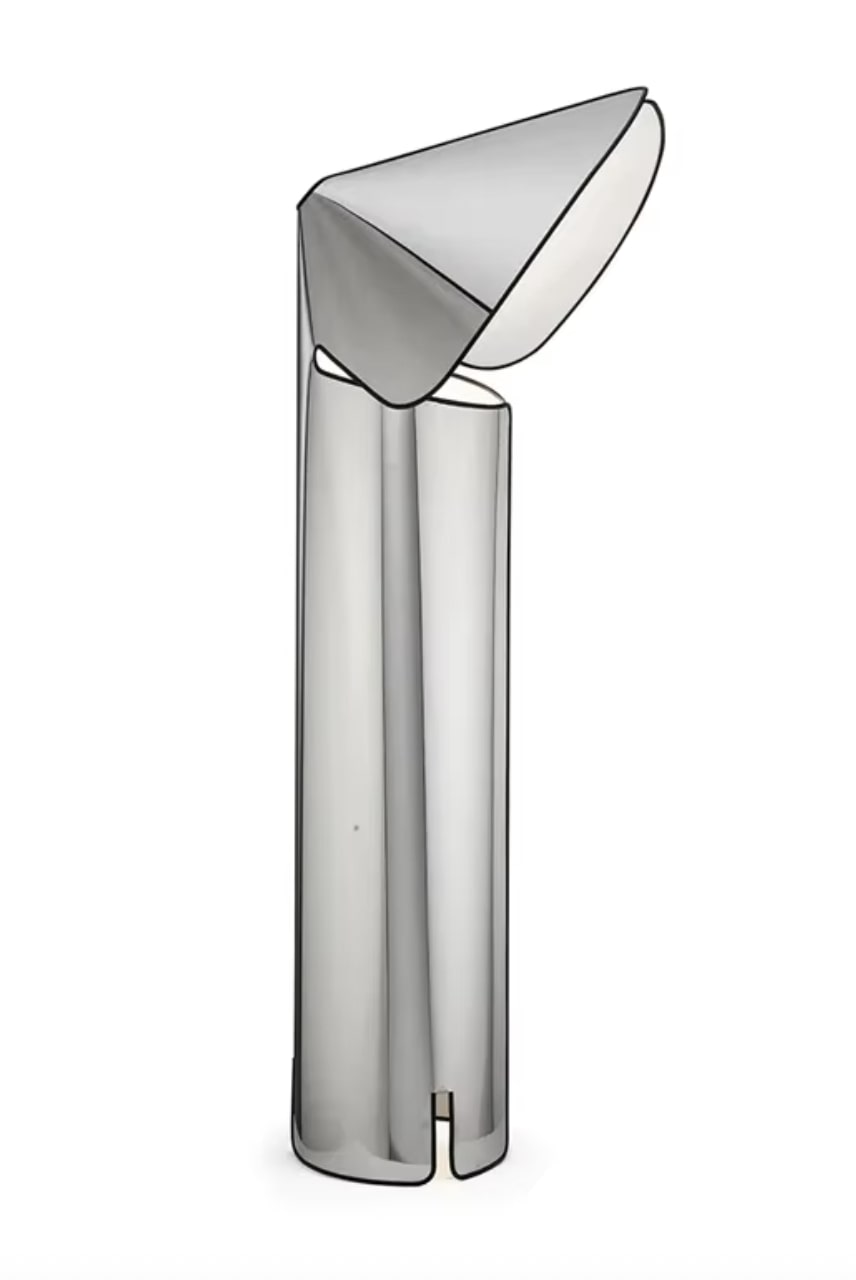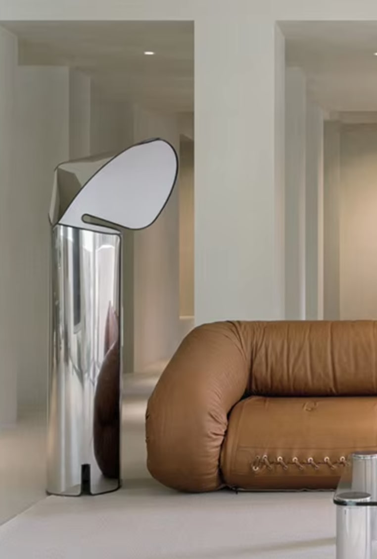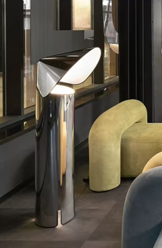 Lampa łączy miękki, organiczny kształt klosza z twardą, industrialną powierzchnią metalu. Wysoka, połyskująca kolumna zestawiona z organicznym kloszem, nadaje pomieszczeniu charakter nowoczesnej elegancji i luksusu. Pełni równocześnie funkcję oświetlenia i wyjątkowego elementu dekoracyjnego, przypominającego rzeźbę. Przeznaczona bardziej do nastrojowego oświetlenia, niż do typowego oświetlania miejsca pracy.