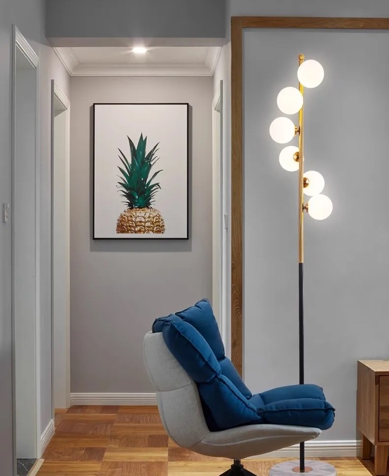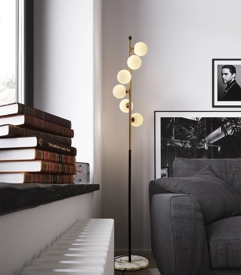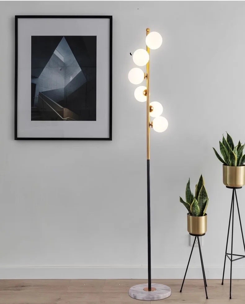 Nowoczesna Elegancka Minimalistyczna Lampa Podłogowa Piano ze Szklanymi Kulami w Kolorze Złotym z Czarnym Elementem