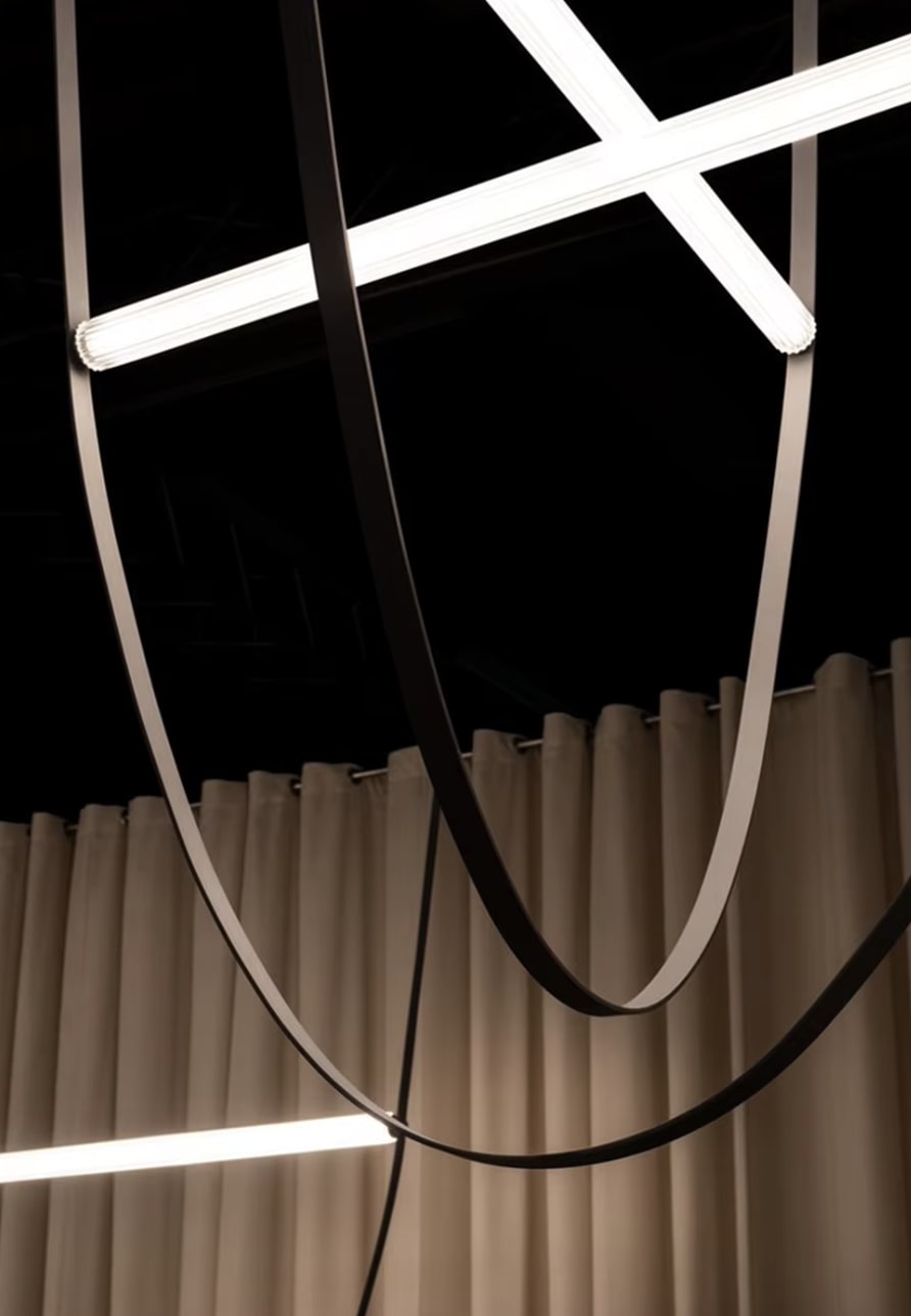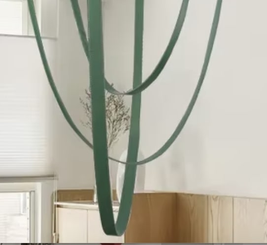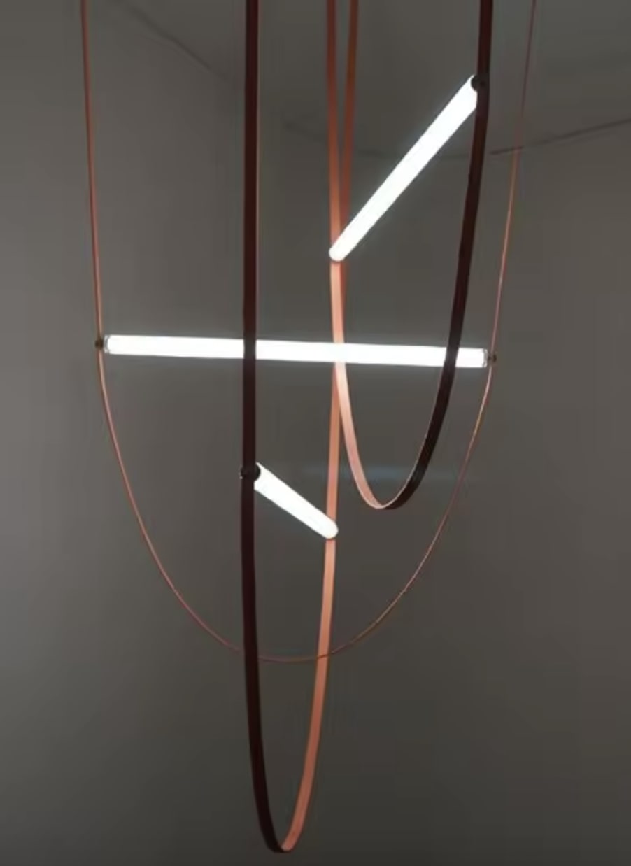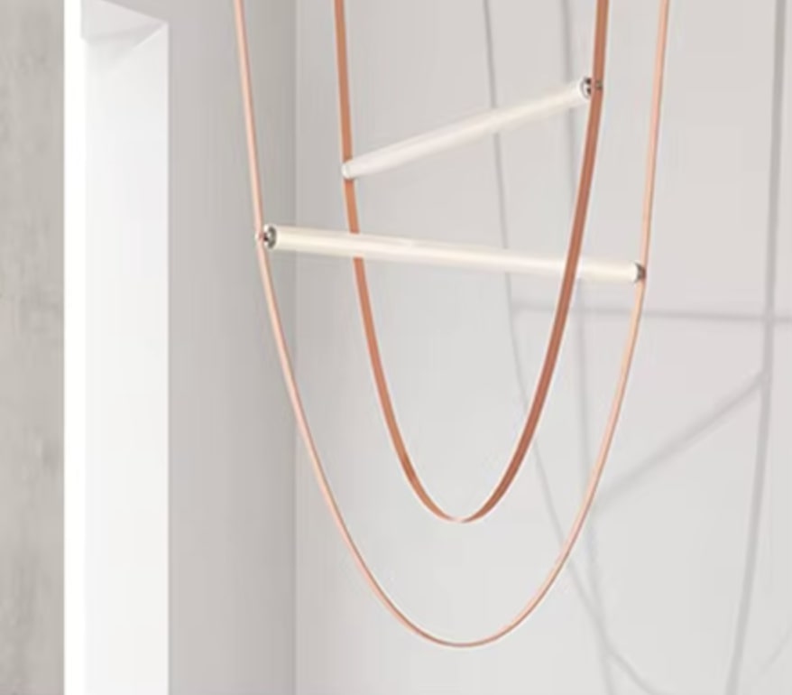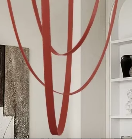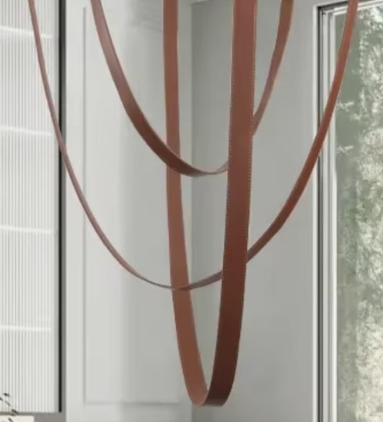 Ta nowoczesna lampa sufitowa LED ze skórzanym pasem ma formę nowoczesnej, rzeźbiarskiej instalacji świetlnej. Jej konstrukcja opiera się na długim, elastycznym pasie, który swobodnie zwisa z sufitu, tworząc miękki, elegancki łuk. Pomiędzy pasami umieszczono smukły, podłużny moduł LED o jasnym, równomiernym świetle. Całość dopełniają dyskretne złote mocowania, nadające lampie wyrafinowany charakter. Dzięki lekkości formy i artystycznemu układowi elementów lampa stanowi efektowny punkt w przestrzeni. Mimo dużych gabarytów lampa wygląda jak minimalistyczna instalacja artystyczna, a nie typowa oprawa.