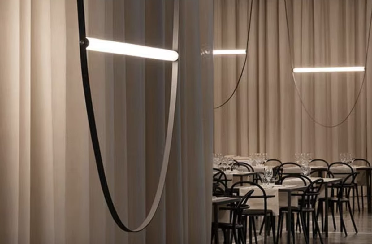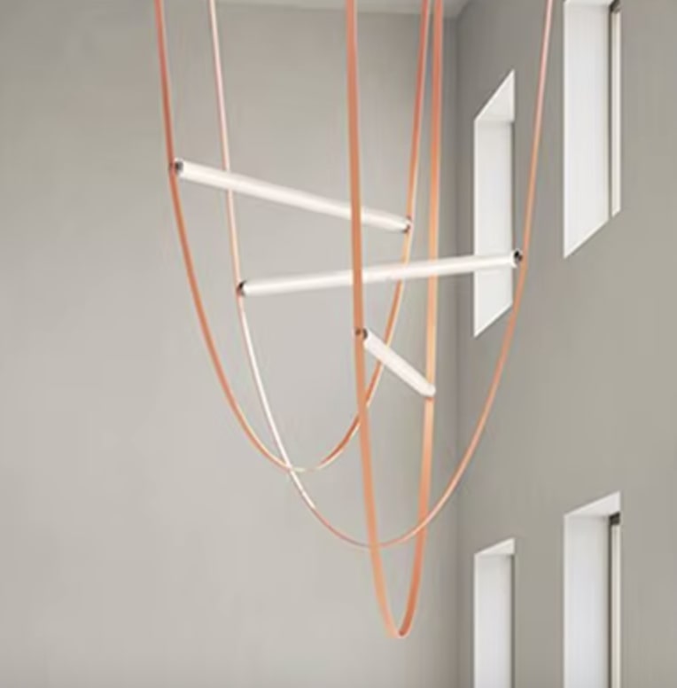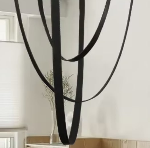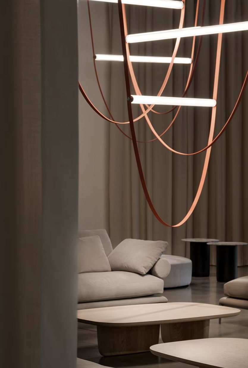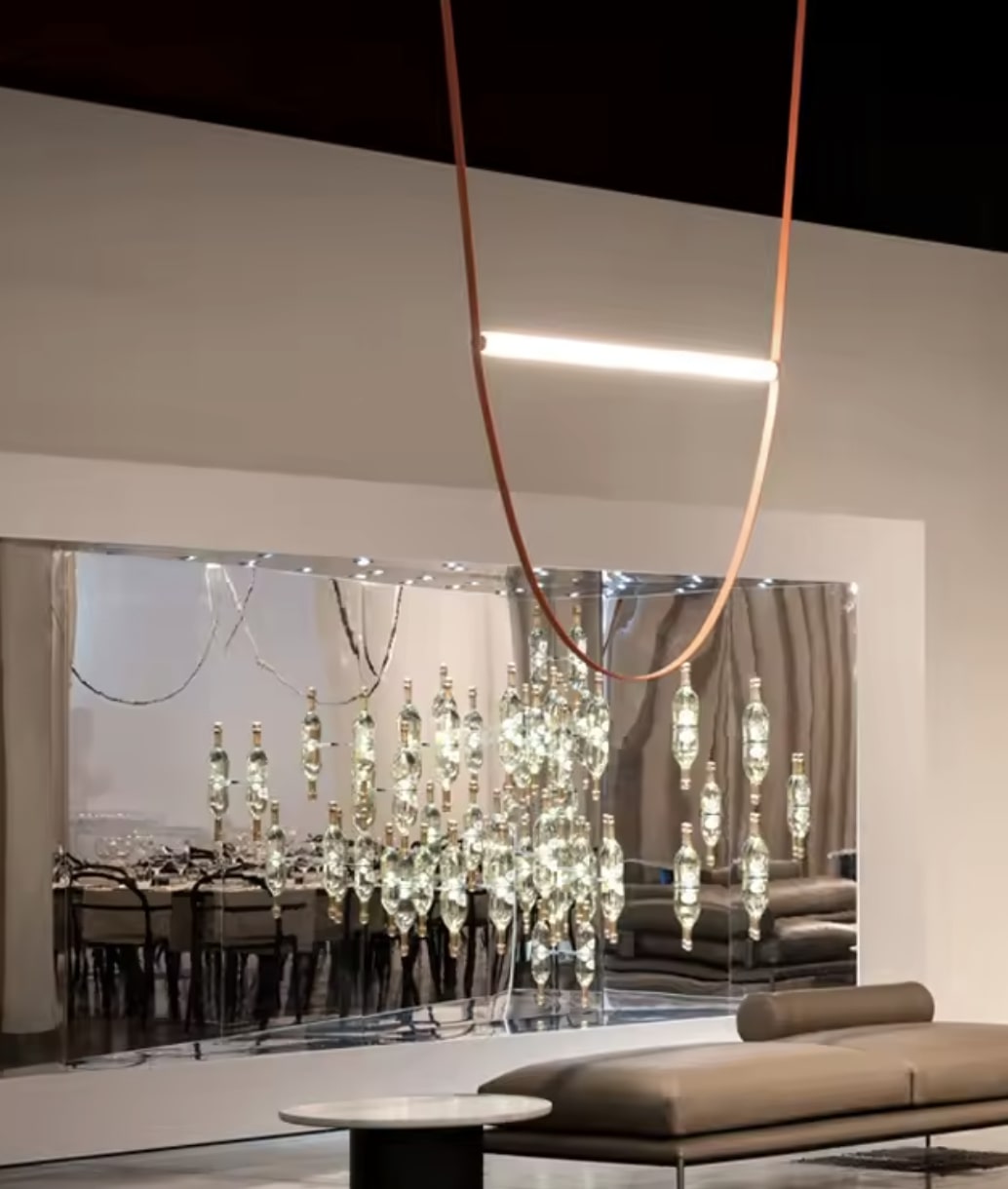 Ta nowoczesna lampa sufitowa LED ze skórzanym pasem ma formę nowoczesnej, rzeźbiarskiej instalacji świetlnej. Jej konstrukcja opiera się na długim, elastycznym pasie, który swobodnie zwisa z sufitu, tworząc miękki, elegancki łuk. Pomiędzy pasami umieszczono smukły, podłużny moduł LED o jasnym, równomiernym świetle. Całość dopełniają dyskretne złote mocowania, nadające lampie wyrafinowany charakter. Dzięki lekkości formy i artystycznemu układowi elementów lampa stanowi efektowny punkt w przestrzeni. Mimo dużych gabarytów lampa wygląda jak minimalistyczna instalacja artystyczna, a nie typowa oprawa.