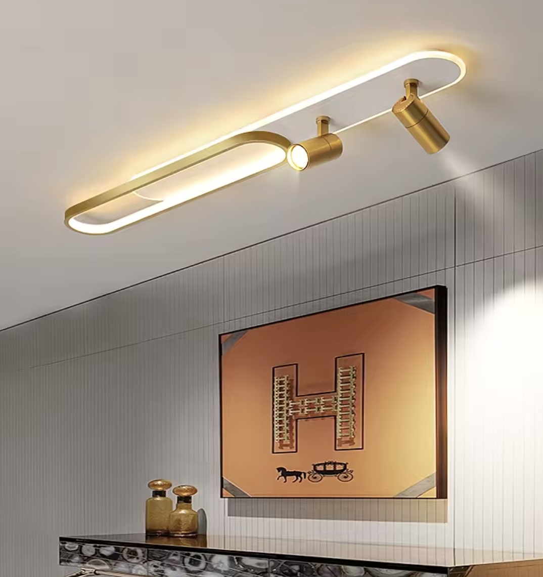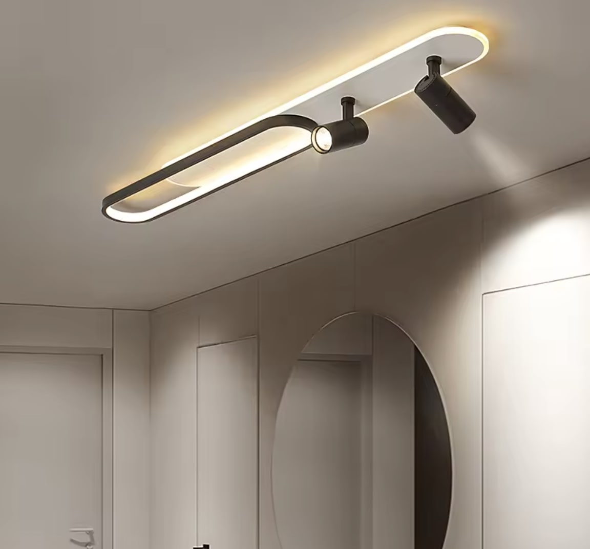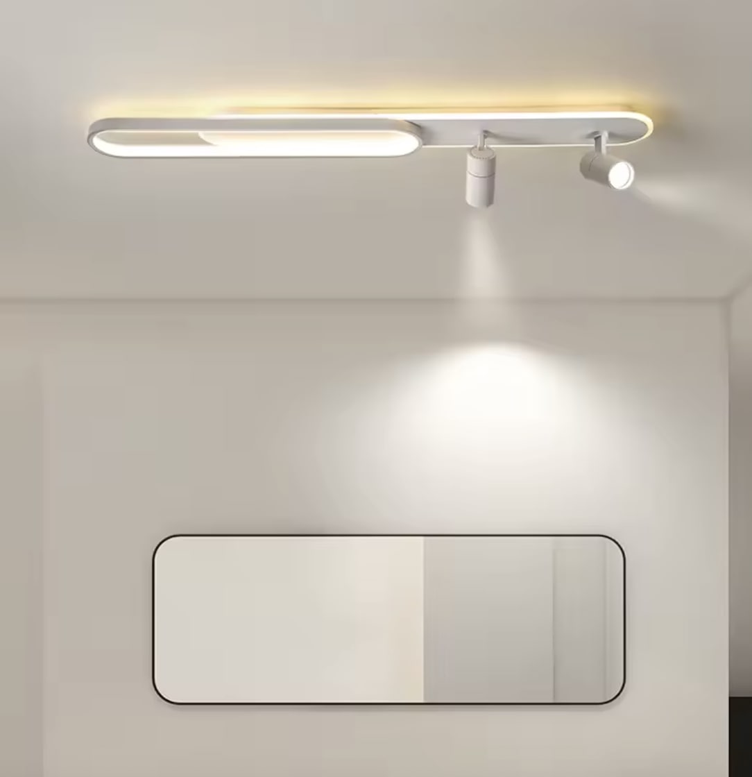 Ta designerska lampa sufitowa została zaprojektowana z myślą o nowoczesnych, estetycznych i funkcjonalnych wnętrzach. Połączenie minimalistycznej formy z inteligentnym rozplanowaniem światła, to idealne rozwiązanie do każdego pomieszczenia, w którym liczy się zarówno styl, jak i komfort użytkowania. Czyste linie, gładka powierzchnia, brak zbędnych zdobień – dzięki temu świetnie wpasuje się do wnętrz urządzonych w stylu minimalistycznym, skandynawskim, modernistycznym lub high-tech. Lampa emituje światło kierunkowe (z reflektorów) oraz rozproszone (z paska LED), co zapewnia równomierne oświetlenie oraz możliwość punktowego doświetlenia wybranych stref. Doskonale sprawdzi się w salonie, jako oświetlenie strefowe lub główne, szczególnie nad sofą, stołem lub przestrzenią wypoczynkową. Także w sypialni może służyć jako główne oświetlenie z opcją punktowego skierowania światła. Idealna również nad blat kuchenny, czy wyspę oraz do przedpokoju albo gabinetu.