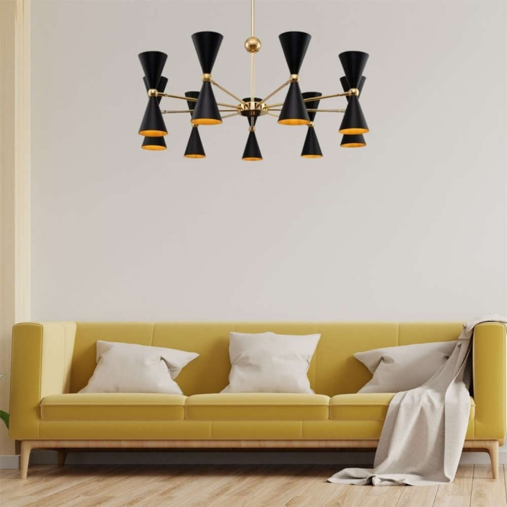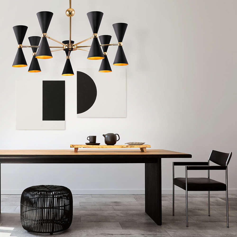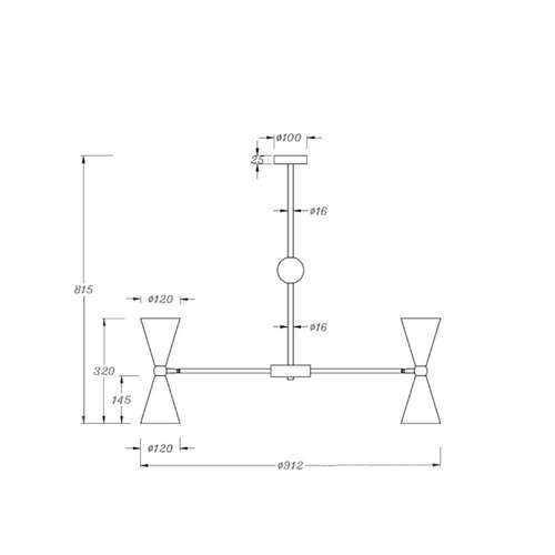 Bardzo efektowna lampa wisząca, cechuje się funkcjonalnym wykonaniem oraz atrakcyjnym designem. Stelaż metalowy, ramiona rozłożyste, ułożone gwiaździście. Klosze w kształcie klepsydry, światło skierowane w górę i w dół. Lampa wprowadza niepowtarzalny nastrój w pomieszczeniu dzięki światłu, które jest dekoracyjnie rozproszone. Oprawa zawieszona w centralnej części pomieszczenia doskonale sprawdzi się jako oświetlenie do jadalni, salonu czy też do biura.