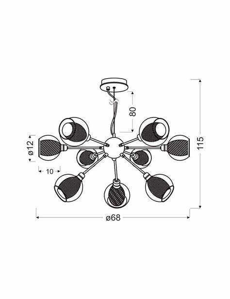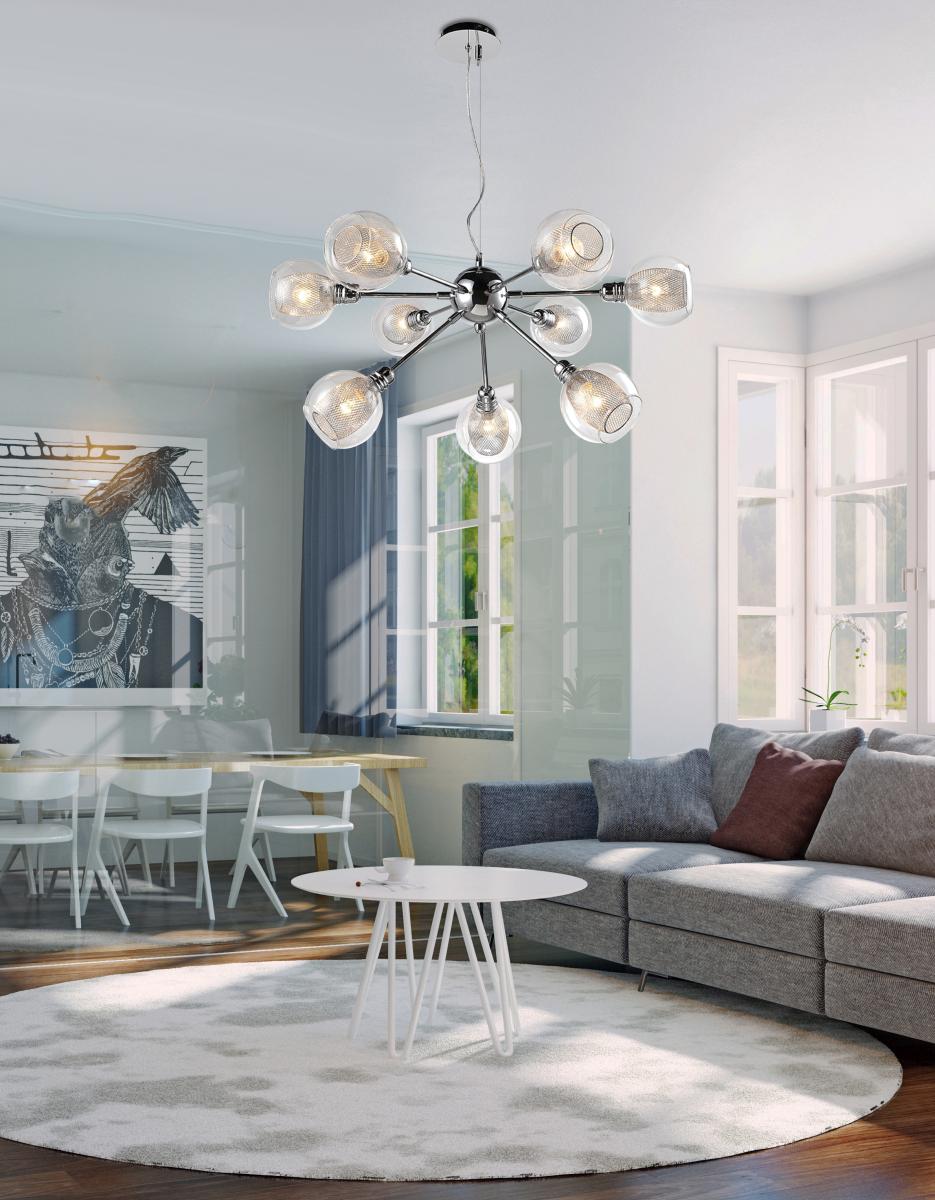 Cała podstawa lampy wykonana jest z metalu, wykończona w kolorze błyszczącego chromu. Nowoczesną lampę wyróżniają podwójne klosze, zewnętrzny z przezroczystego szkła, wewnętrzny ażurowy z metalowej chromowanej siateczki. Wspólnie rozpraszają światło, zapewniając dodatkowe efekty świetlne. Lampa będzie ozdobą każdego nowoczesnego wnętrza: salonu, kuchni, jadalni, korytarza, hotelowego holu, biura. W lampie zastosowano 9 źródeł światła na gwint E14, co daje możliwość oświetlenia nawet większych pomieszczeń. Lampa DIXI wkomponuje się w wnętrza w nowoczesnym, modernistycznym stylu, ale będzie również współgrać ze stylem boho.