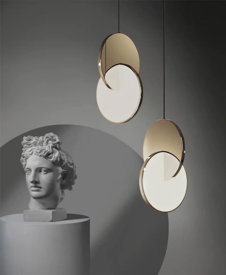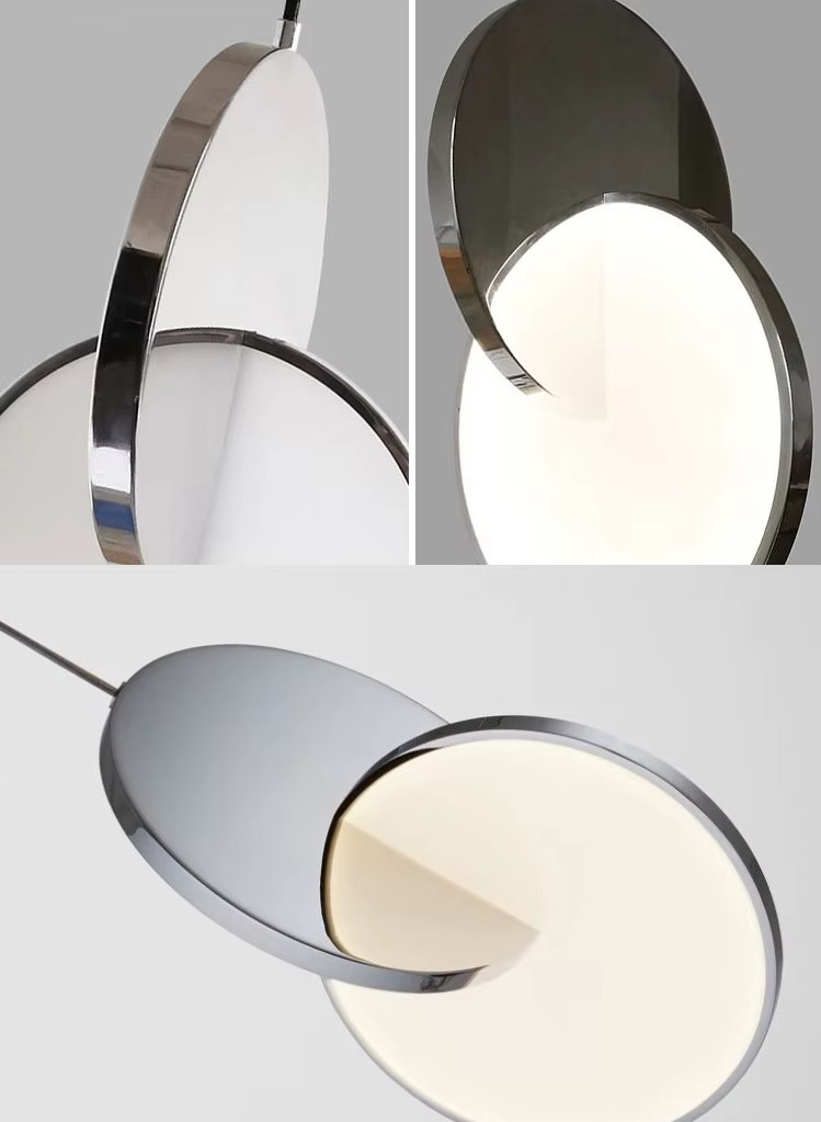 Lampa wisząca Eclipse jest niebiańska zarówno pod względem nazwy, jak i inspiracji. Polerowane na złoto lub chromowane lustrzane i akrylowe krążki oddziałują na siebie, rozcinają i zaciemniają, co jednocześnie przyćmiewa i odsłania widzowi swoje światło.