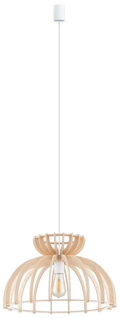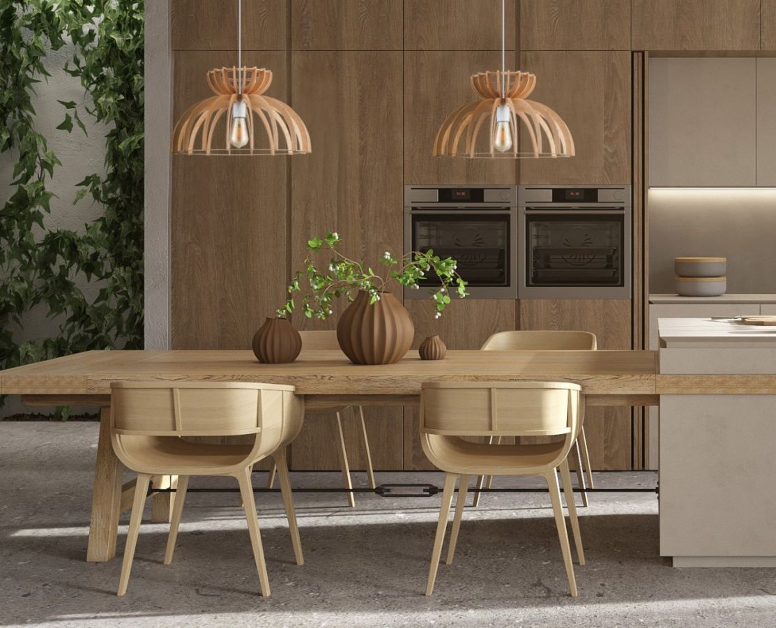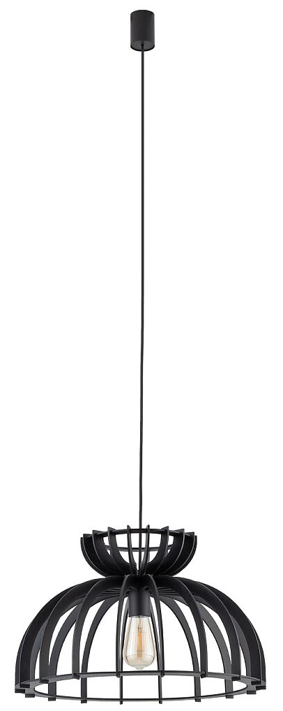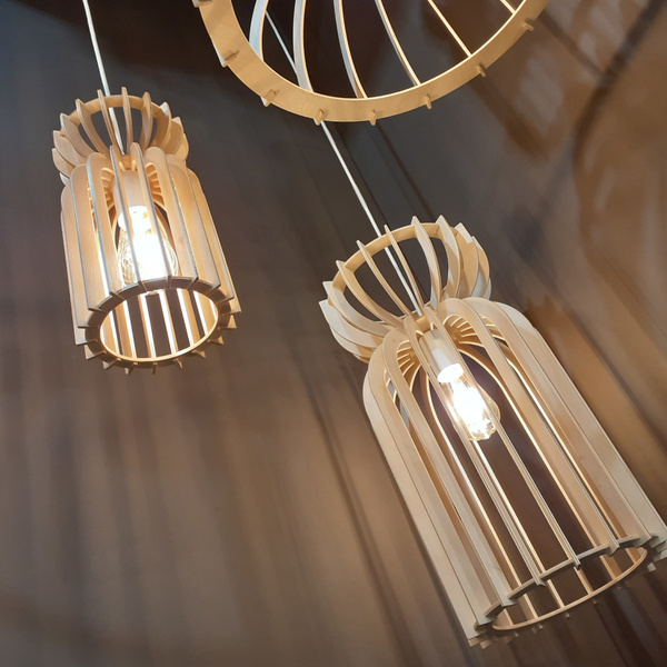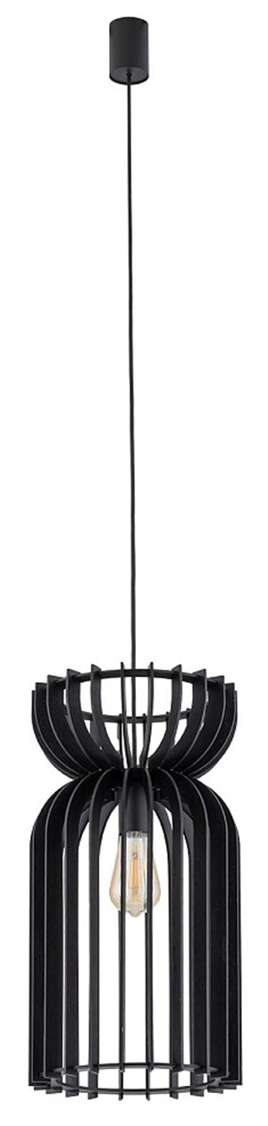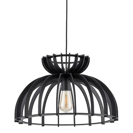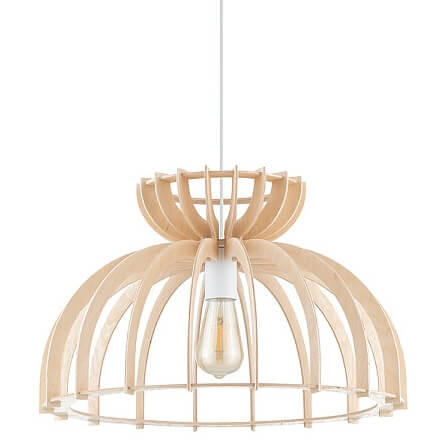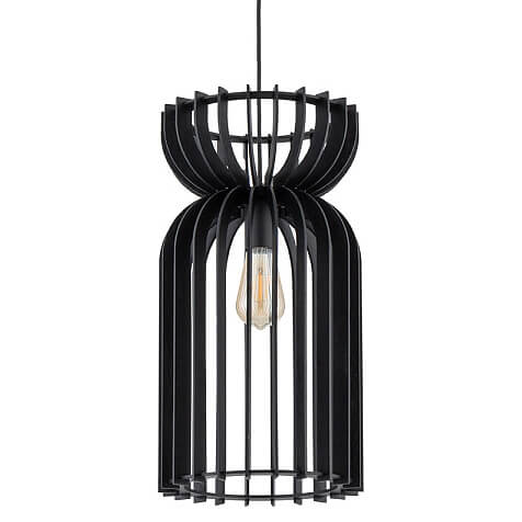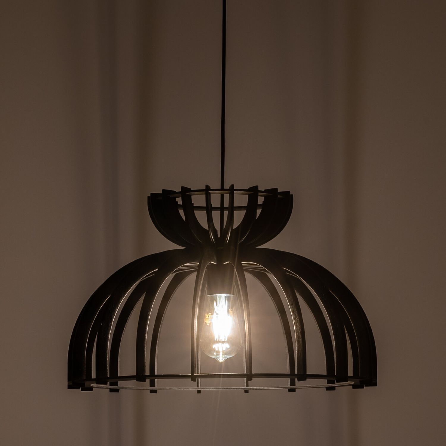 Lampa wisząca Kymi została wykonana ze sklejki oraz stali w kolorze czarnym oraz jasnego drewna. Z uwagi na swój niepowtarzalny design pasuje do wnętrz w stylu boho lub nowoczesnym. Ciekawie prezentuje się w instalacjach świetlnych kilku sztuk obok siebie. Szczególnie sprawdzi się w salonie, kuchni lub jadalni.