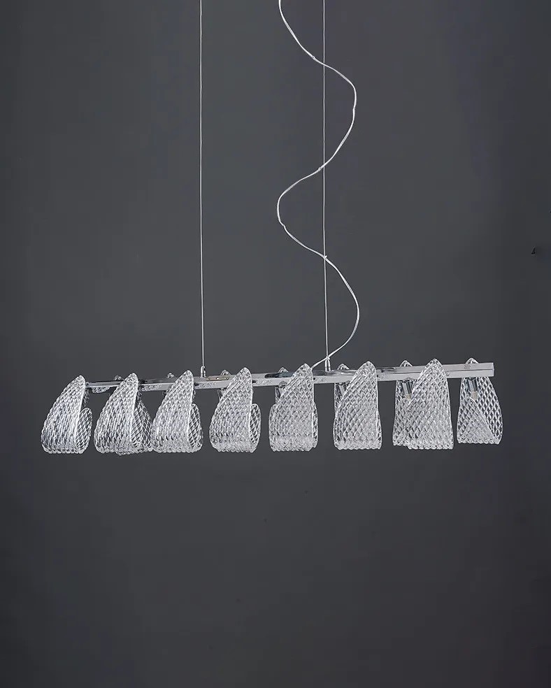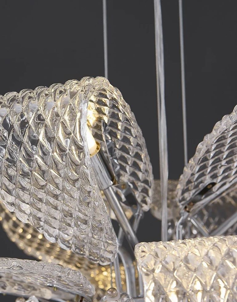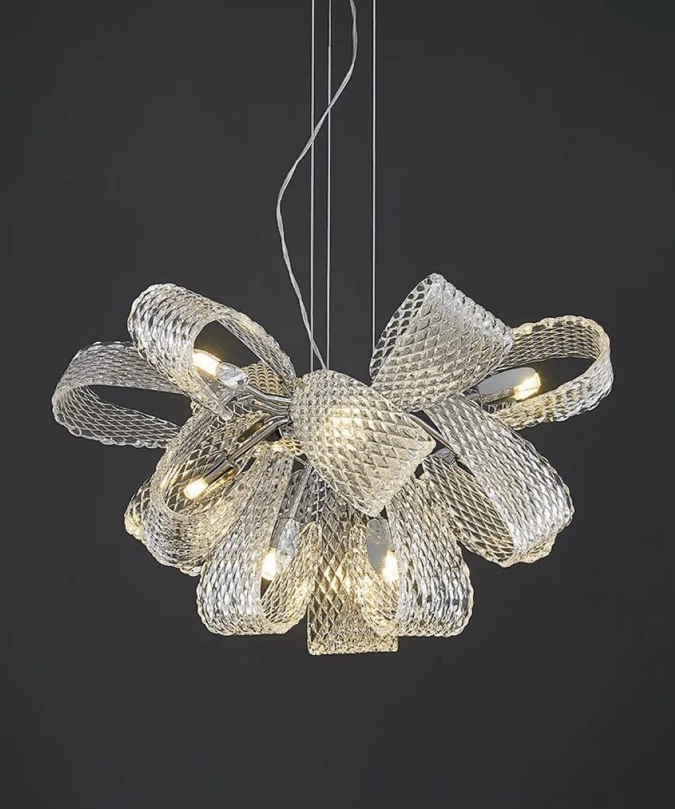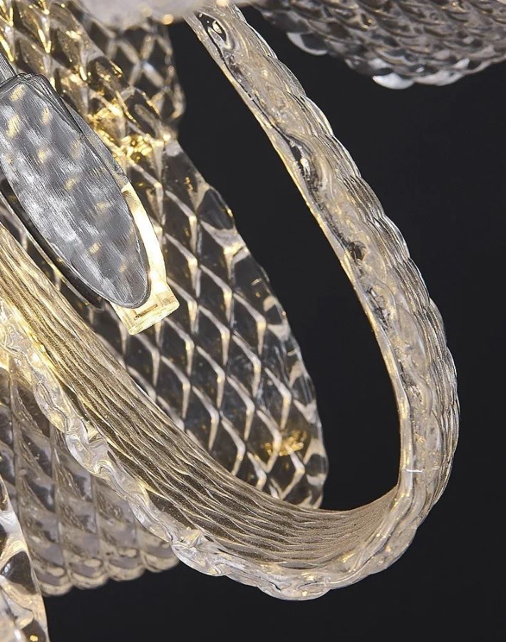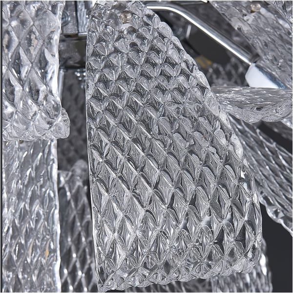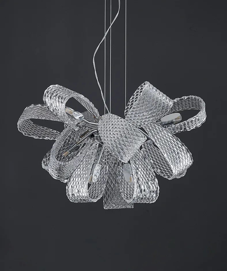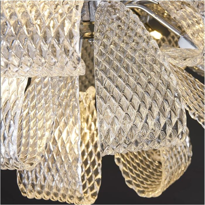 Lampa Monigo proponuje wspaniałą kompozycję zakrzywionych, teksturowanych wstążek szklanych. Została zaprojektowana tak, aby stworzyć atrakcyjną atmosferę w każdym pomieszczeniu. Efekt diamentu uzyskuje się poprzez odciśnięcie wzoru na szkle na gorąco. Światło płynie wzdłuż linii wzorzystej powierzchni, podkreślając metalowe detale ramy i tworząc wspaniałą grę migoczącego światła. Metalowa konstrukcja występuje w wersji polerowanego złota i chromu. Lampa w pomieszczeniu stanowi bardzo elegancką i ładną ozdobę, jednocześnie dając dużo światła.