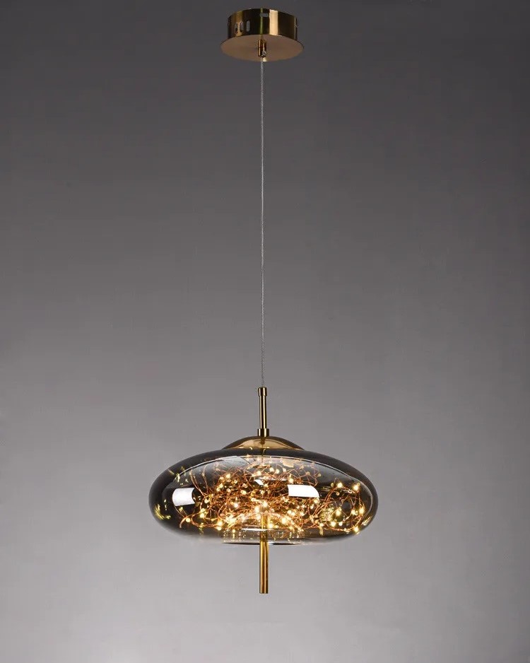 Nowoczesna lampa wisząca Valencia to wyjątkowe rozwiązanie w stylu glamour, które stanie się wyrazistym akcentem aranżacji, odznaczającym się ponadczasową elegancją i szykiem. Valencia to niezwykle stylowa oprawa, której nie sposób zignorować. Ta nietuzinkowa dekoracja zapewni bajkowe wręcz efekty wizualne, przywodząc na myśl płynne złoto zaklęte w transparentnej bańce z osadzonymi na jej ściankach kropelkami.