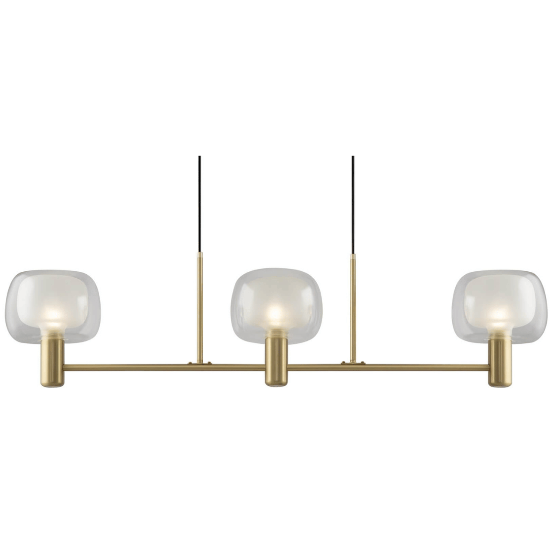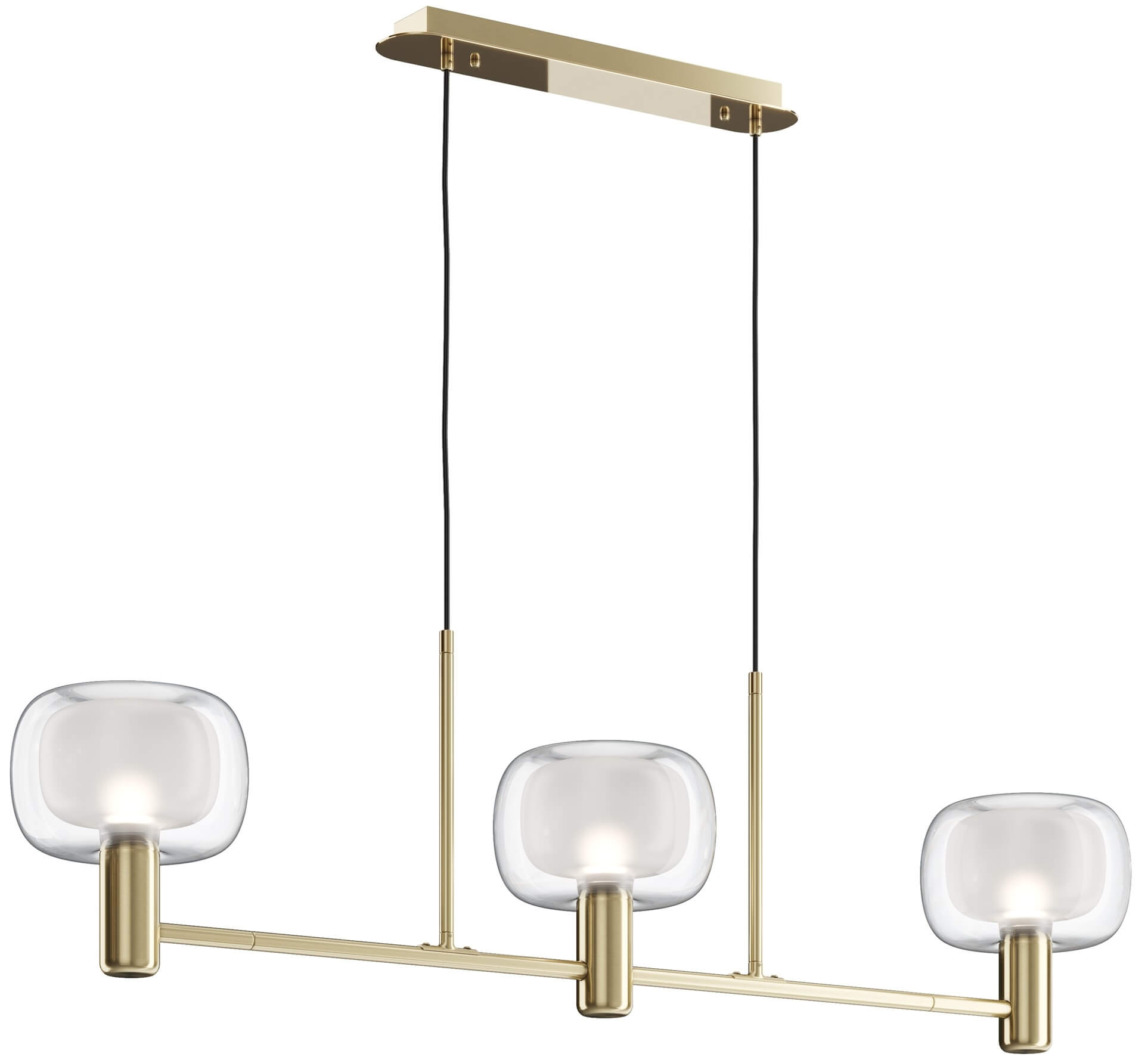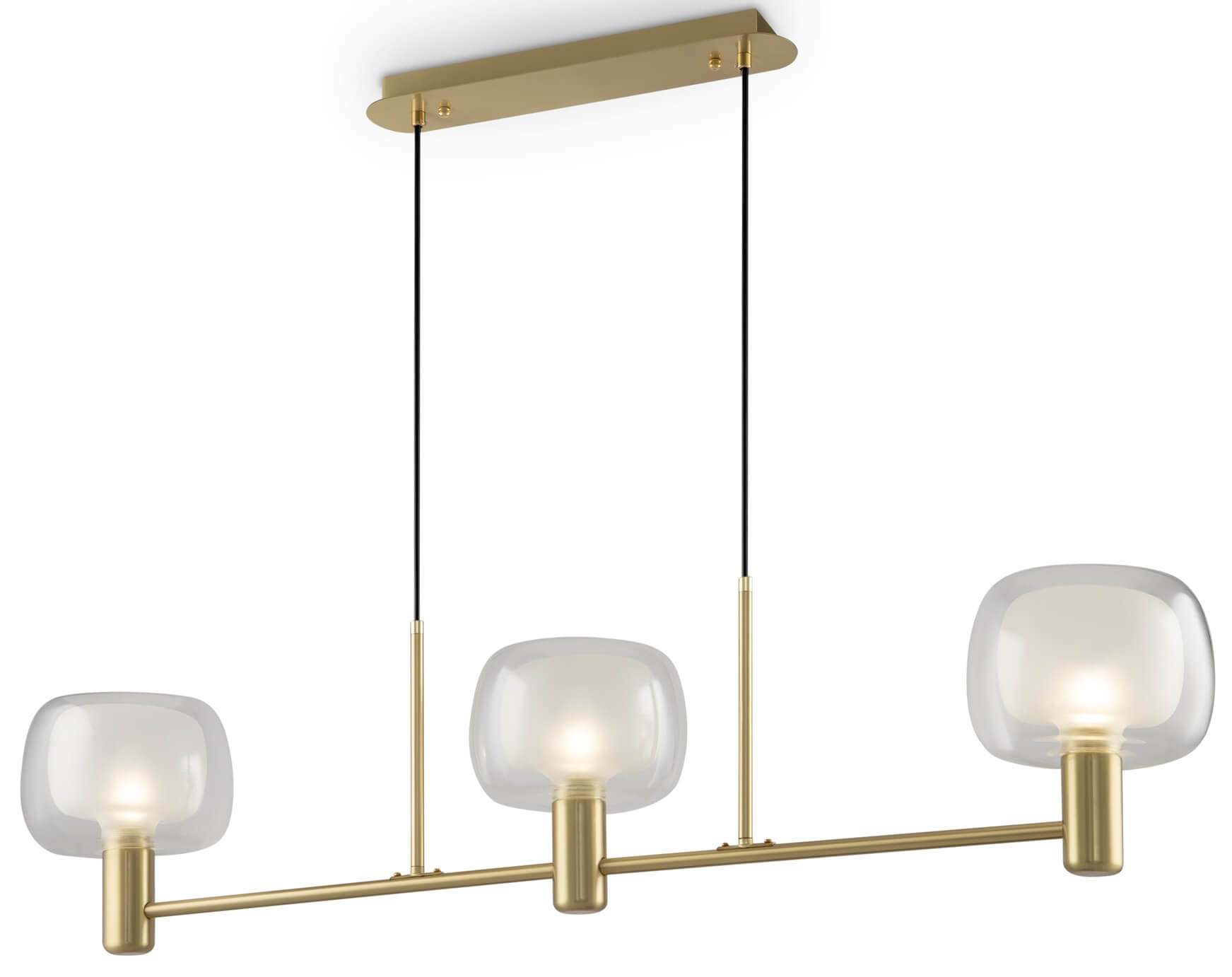 Lampa wisząca Vision to wcielenie elegancji i nowoczesnego wzornictwa. Jej złoty stelaż, będący jednocześnie konstrukcyjnym elementem oraz ozdobą, posiada 3 harmonijne ramiona. Każde z tych ramion zakończone jest poprzeczną rurką i szklanym, okrągłym kloszem, którego forma jest zaokrąglona i delikatnie unosząca się ku górze. Klosz wewnętrznie zdobi warstwa mleczna, podczas gdy na zewnątrz jest on osłonięty przez przezroczystą powłokę.