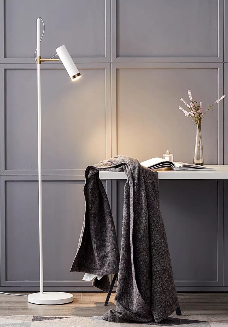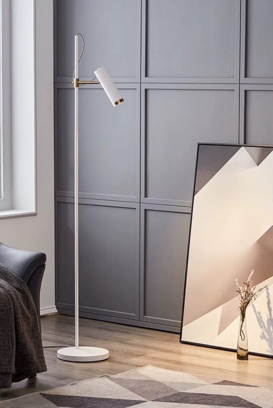 Nowoczesna minimalistyczna metalowa lampa podłogowa Kavos w kolorze białym i czarnym idealna do salonu, sypialni, gabinetu.