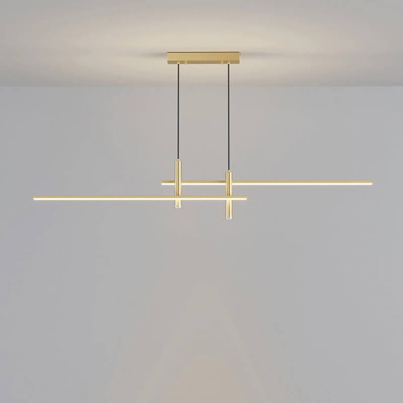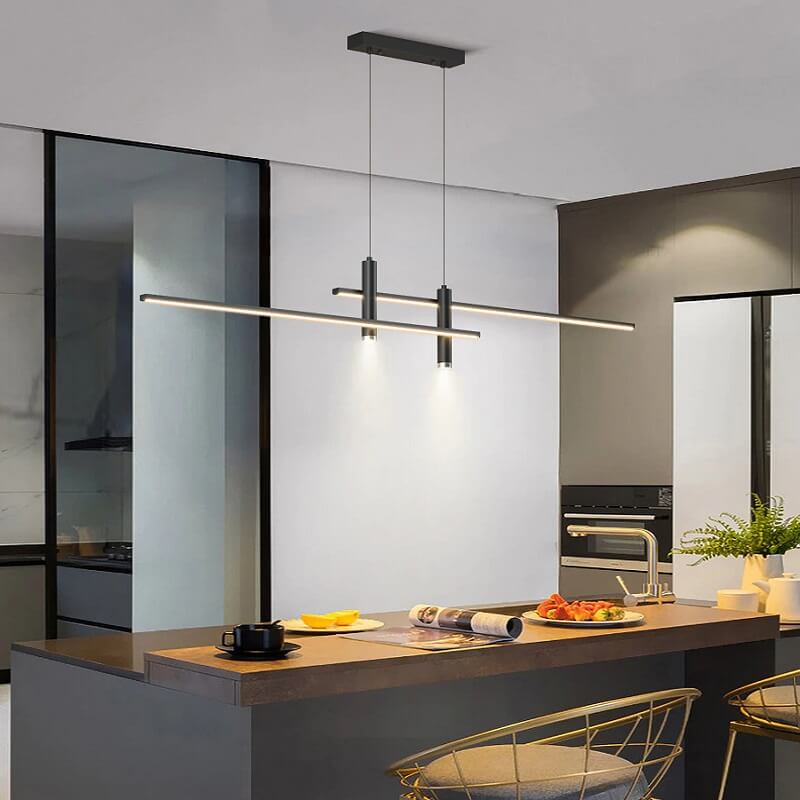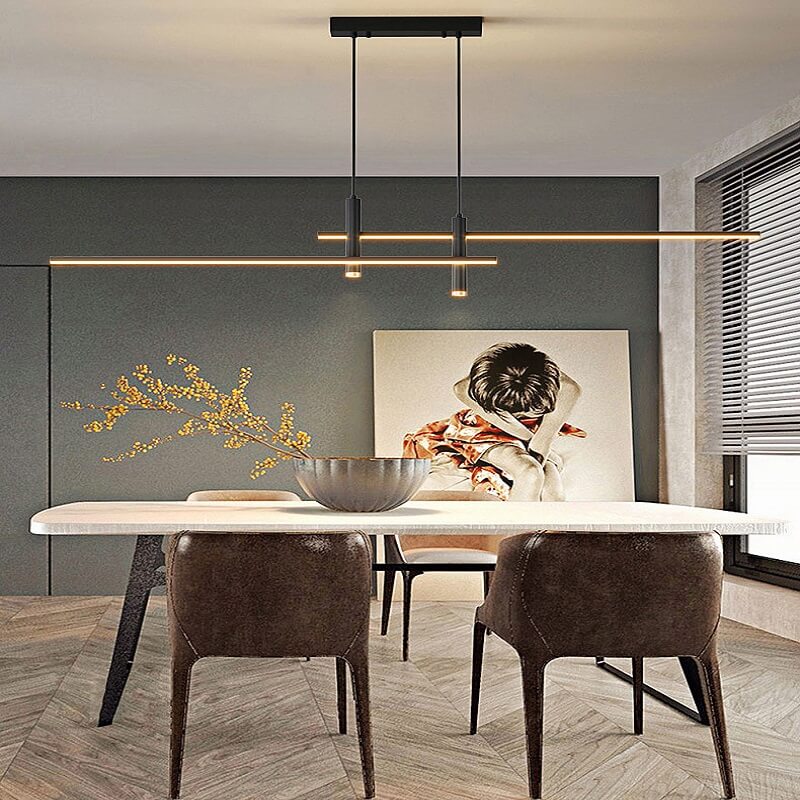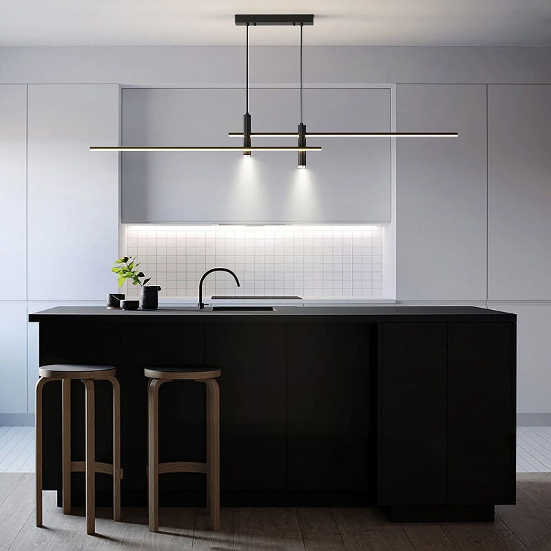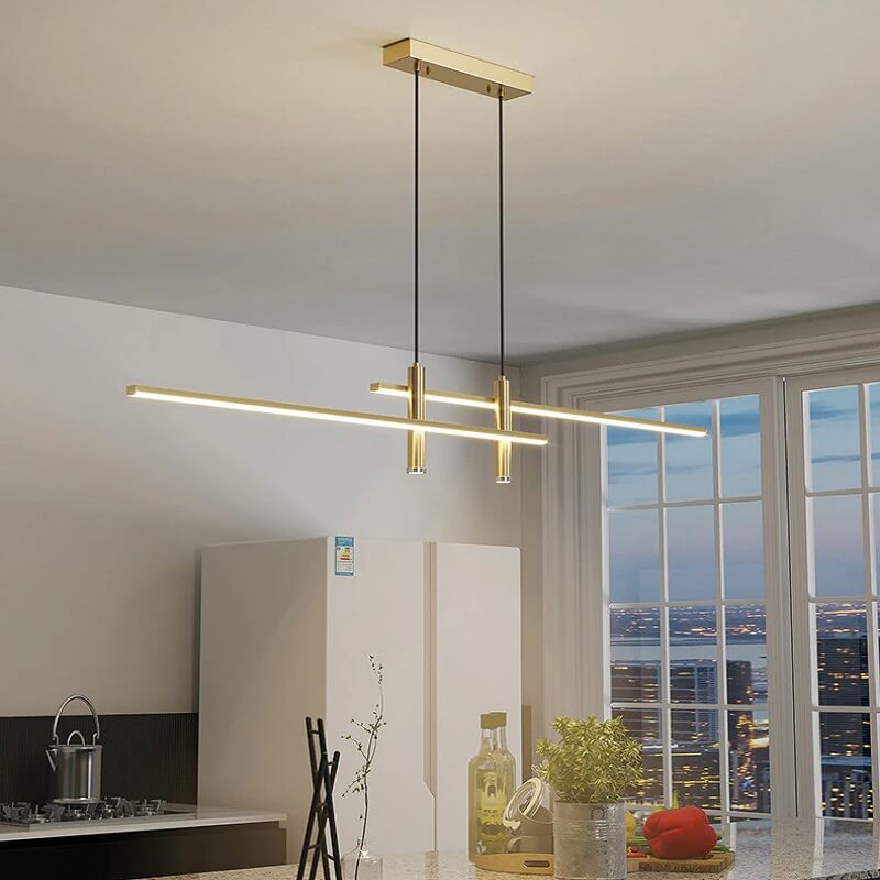Nowoczesna minimalistyczna i elegancka podłużna lampa wisząca Taśma LED w kolorze złotym i czarnym idealna do kuchni, jadalni, salonu.