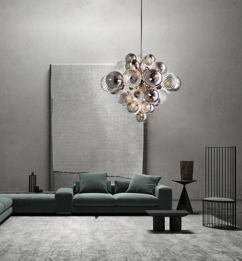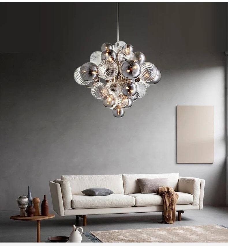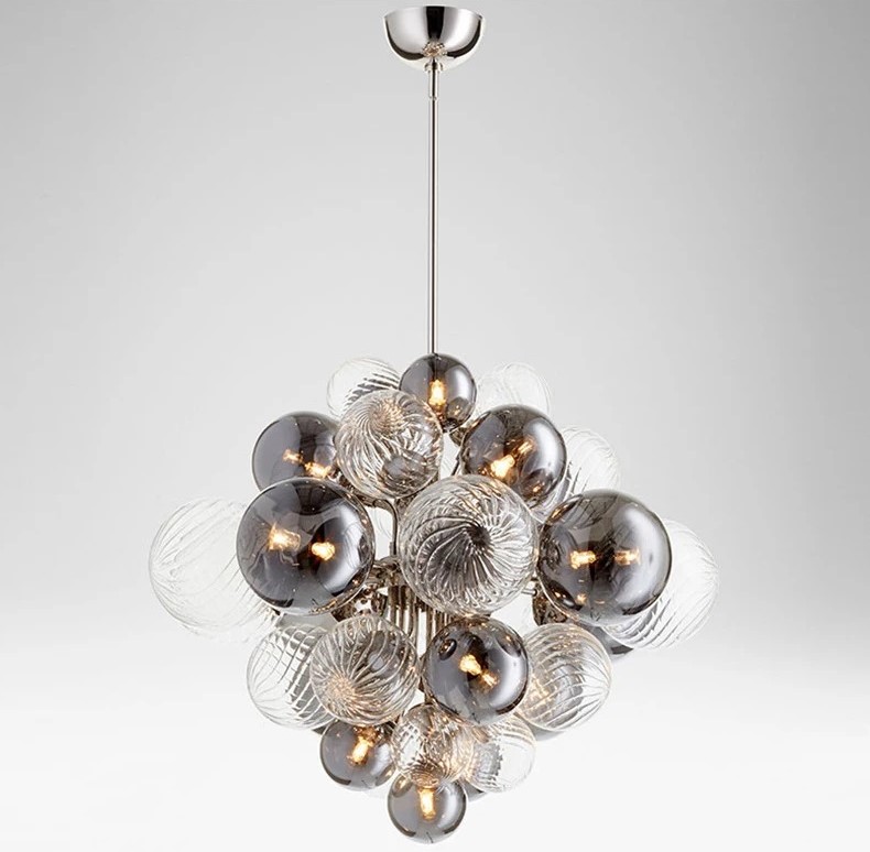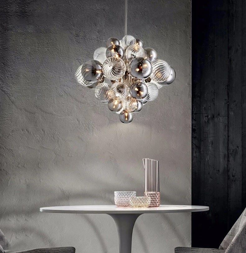 Szklana wisząca lampa Sphere charakteryzuje się oryginalnym kształtem, a mianowicie składa się z kilkunastu okrągłych kloszy, które dodadzą pomieszczeniu wiele światła i wprowadzą w to wnętrze odrobinę luksusu. Ten produkt doskonale sprawdzi się w designerskich salonach.
