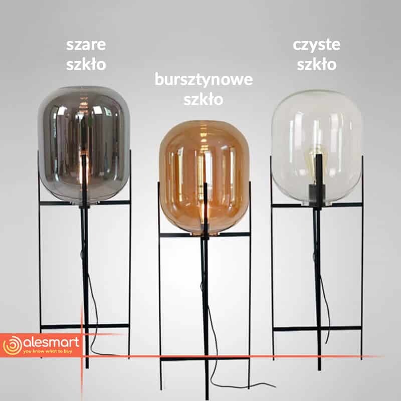 Nowoczesna szklana lampa podłogowa Oda w kolorze szarym, bursztynowym i przezroczystym. Idealna do salonu, sypialni, pokoju, korytarza.