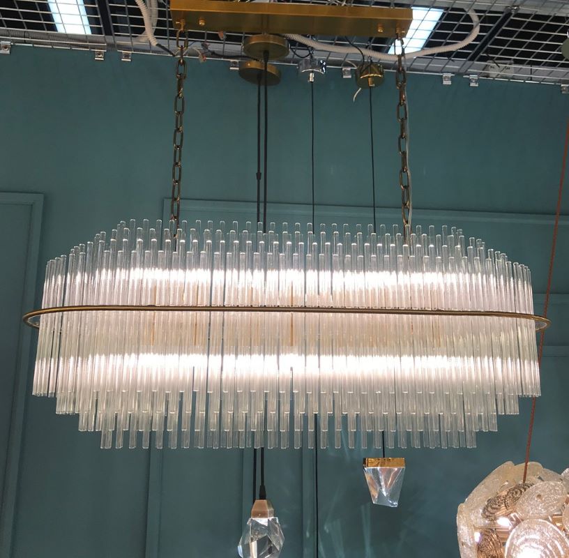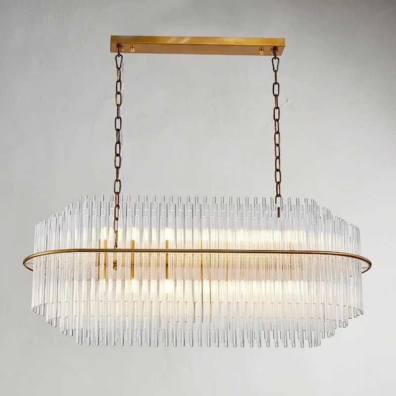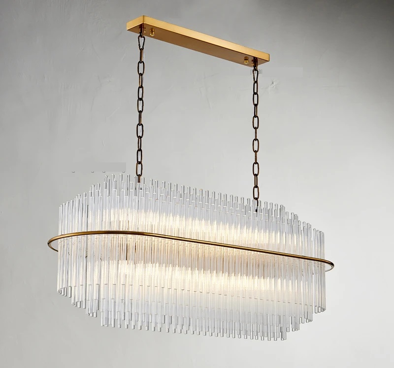 Nowoczesna szklana lampa wisząca East. Żyrandol podłużny w kolorze złotym.