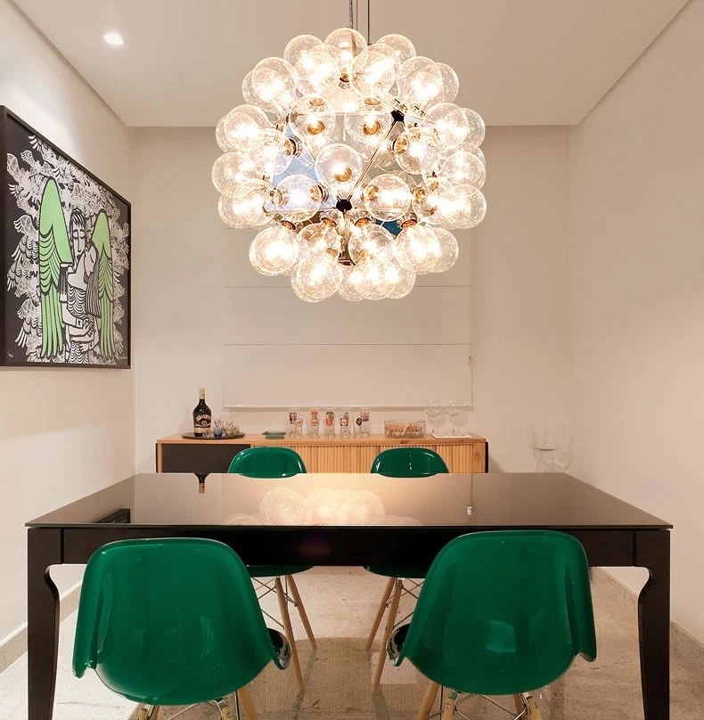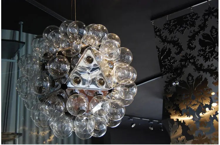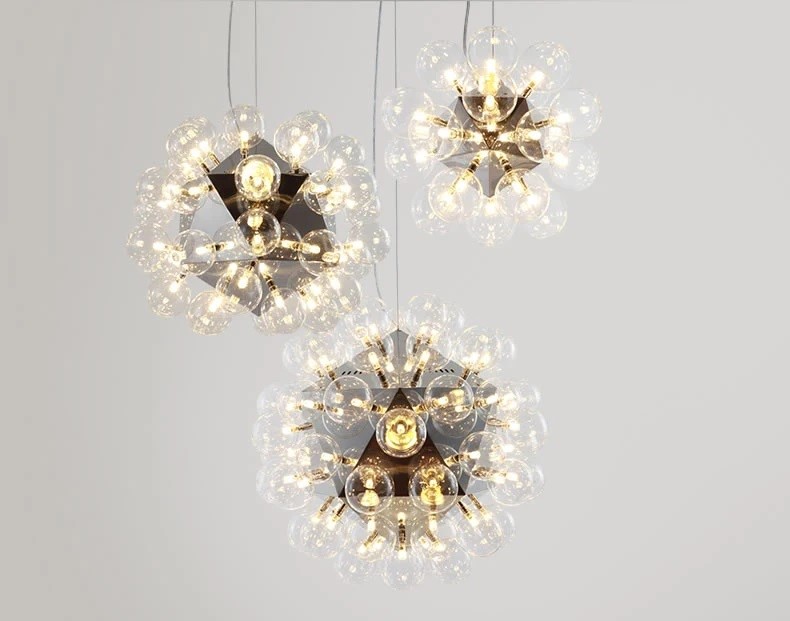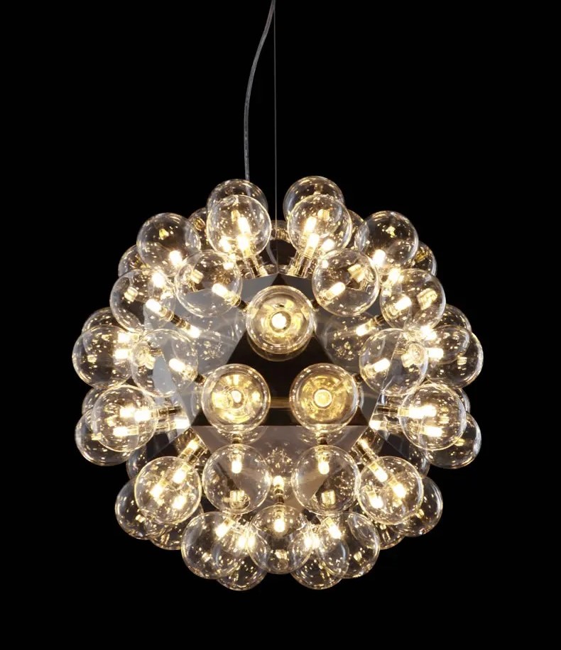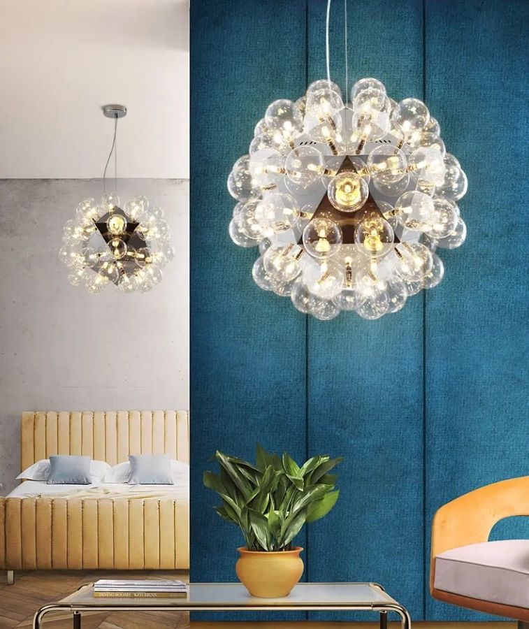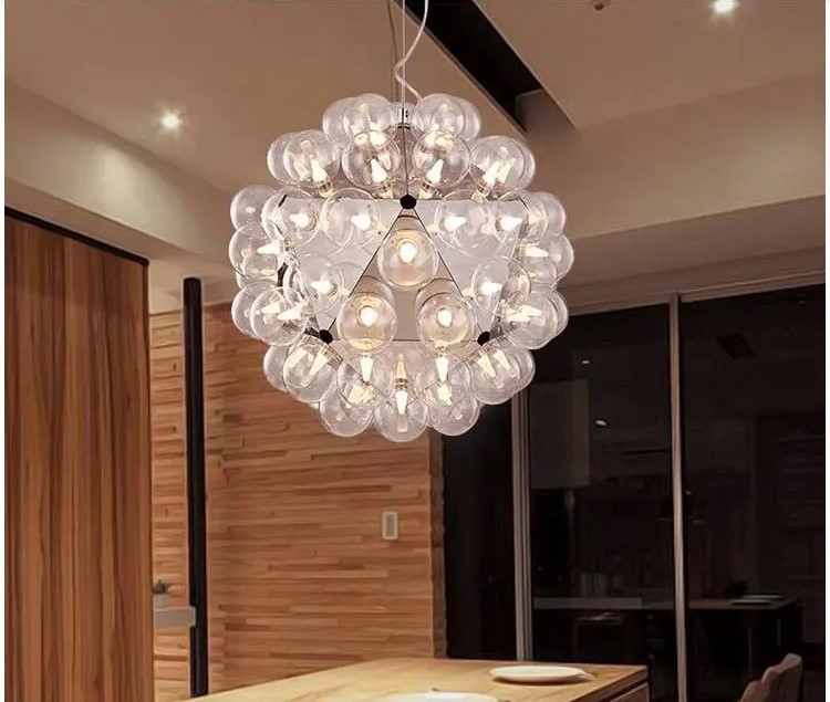 Lampa wisząca Taraxacum Bubbles uzyskuje swój spektakularny wygląd dzięki przezroczystym żarówkom, w które jest wyposażona. Są one wkręcane w liczne gniazdka i wytwarzają nie tylko jasne światło, ale także błyskotliwe iskry, które sprawiają, że pomieszczenie wydaje się cudownie eleganckie. Lampa świeci jasnym, musującym światłem, a w ten sposób powstaje specjalny wygląd szkła, który robi spore wrażenie nawet po wyłączeniu.