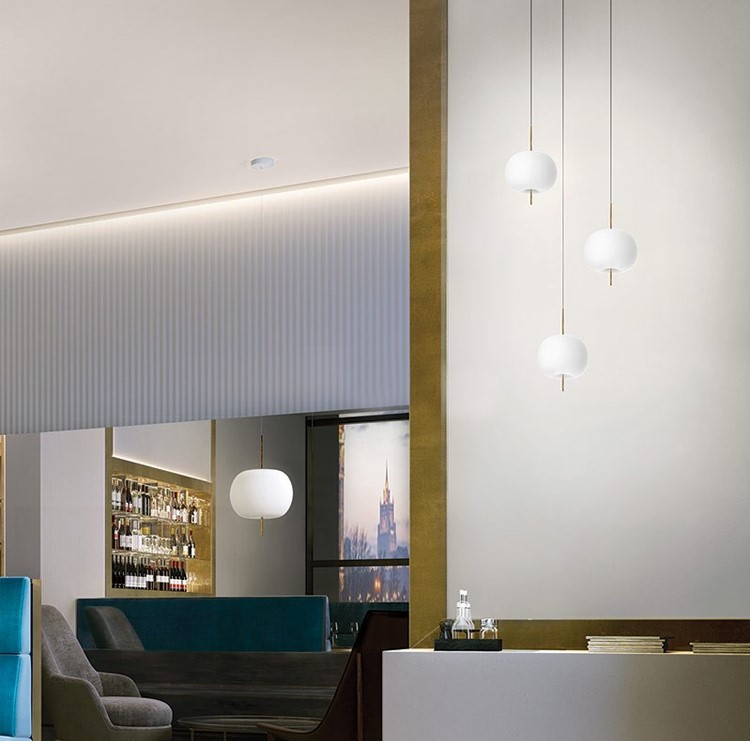 Jeśli spojrzeć na lampę wiszącą Kushi, budzą się natychmiast skojarzenia z nabitą pianką marshmallow lub kandyzowanym jabłkiem. Kula lampy wykonana z dmuchanego szkła jest przewiercona przez cienki metalowy pręt, który wystaje ozdobnie na obu końcach. Szklana kula otacza oprawy E27, których światło jest delikatnie kierowane do pomieszczenia i zapewnia nastrojowe oświetlenie ogólne. Zarówno indywidualnie, jak i w układzie kilku lamp Kushi, lampa wisząca wygląda bardzo wdzięcznie i nowocześnie. Nadaje się do oświetlenia w połączeniu z wieloma stylami wyposażenia wnętrz.