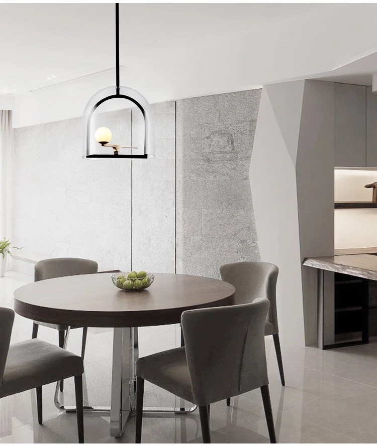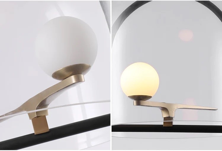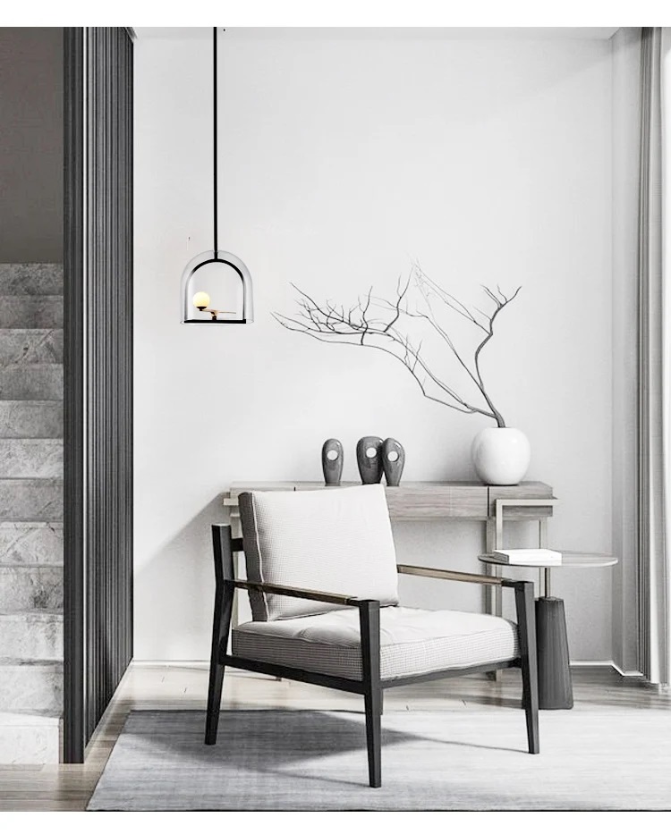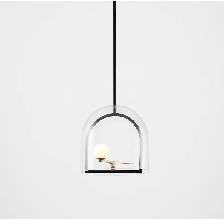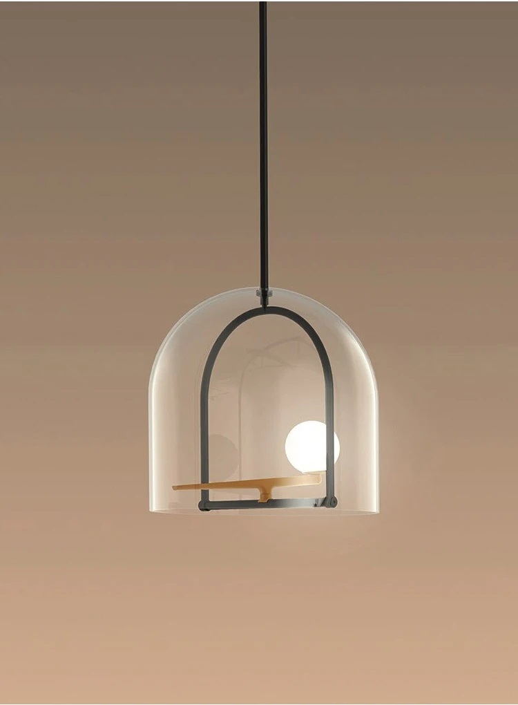 Lampa wisząca Yanzi kojarzy się z ptakiem siedzącym na drążku w klatce ochronnej. Na czarnym drążku podstawy przymocowane jest niewielkie, metalowe ramię w kolorze mosiądzu, a na nim znajduje się biała, szklana kula podświetlana diodami LED. Rolę klatki zabezpieczającej pełni w tym przypadku przezroczysty, szklany klosz, który umożliwia rozchodzenie się światła we wszystkich kierunkach.