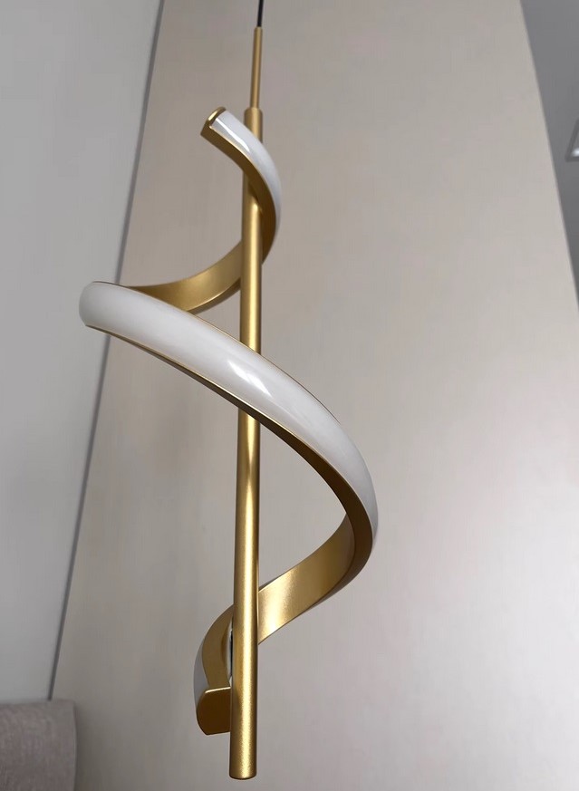 Nowoczesna minimalistyczna zakręcona sufitowa lampa wisząca Espiral spirala LED w kolorze złotym i czarnym.