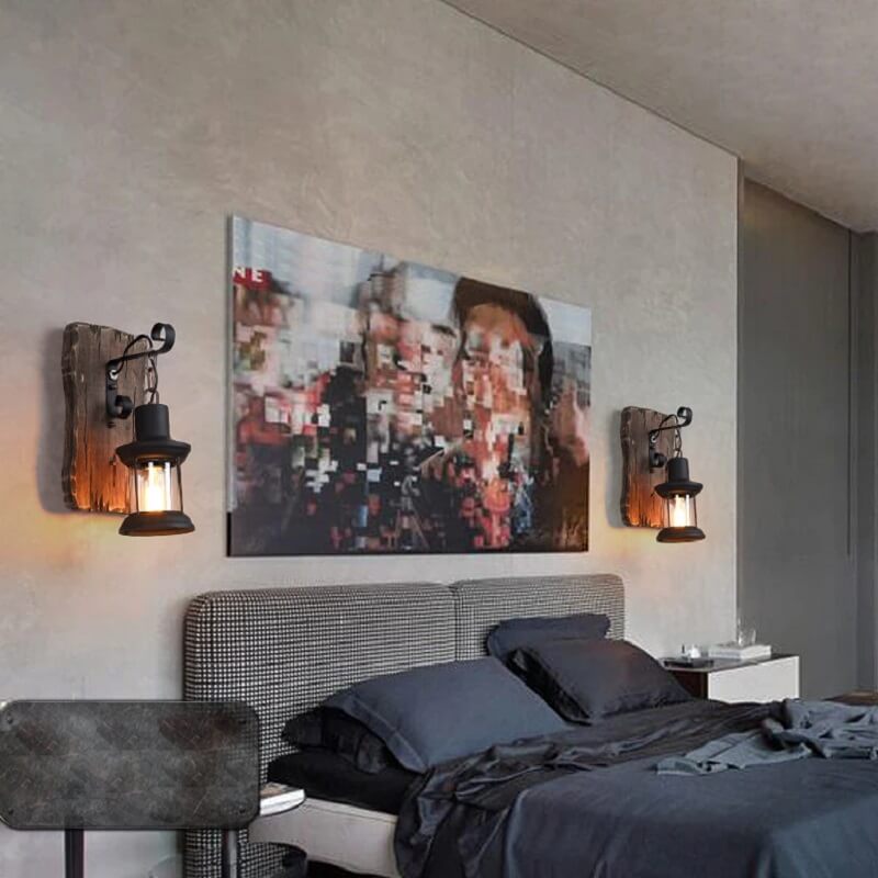 Rustykalna oryginalna drewniana lampa ścienna idealna do sypialni, salonu, gabinetu, korytarza.