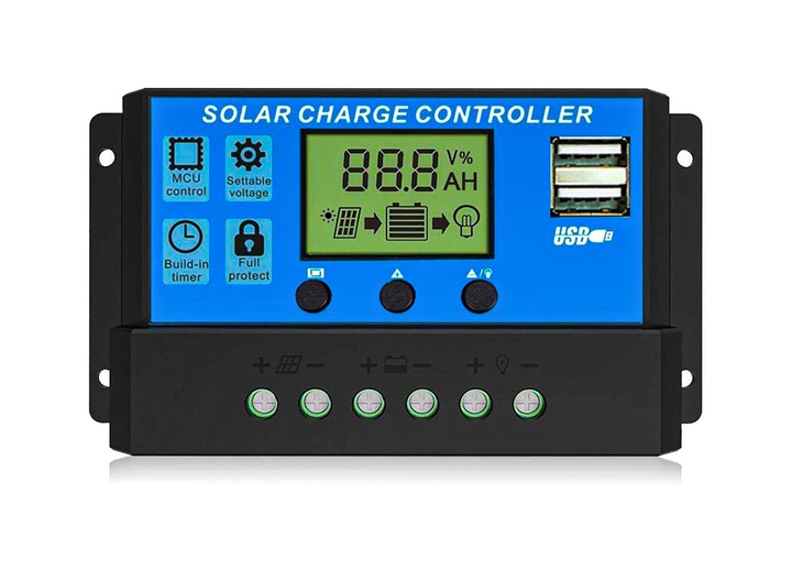 - ładuje akumulatory metodą PWM. Moduluje zakres napięcia od 0 do 100%, co pozwala na szybkie i stabilne ładowanie akumulatora niezależnie od pogody i stanu systemu solarnego