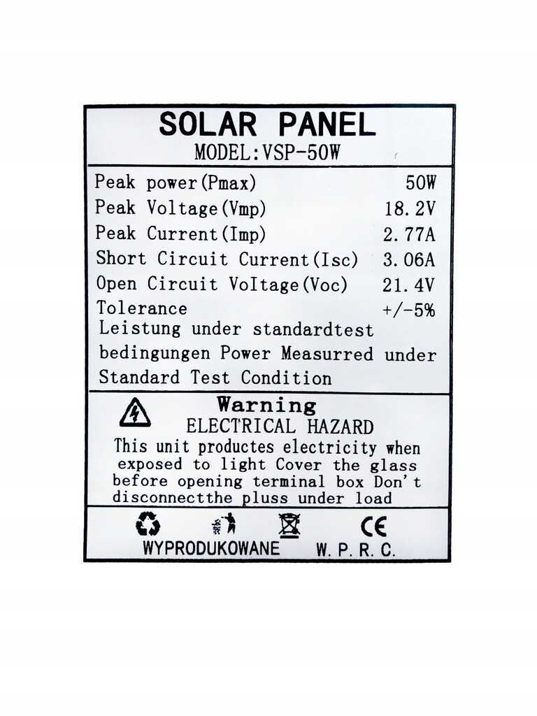 - PANEL FOTOWOLTAICZNY POLIKRYSTALICZNY O MOCY 50W Wymiary: 660 x 530 x 35 mm