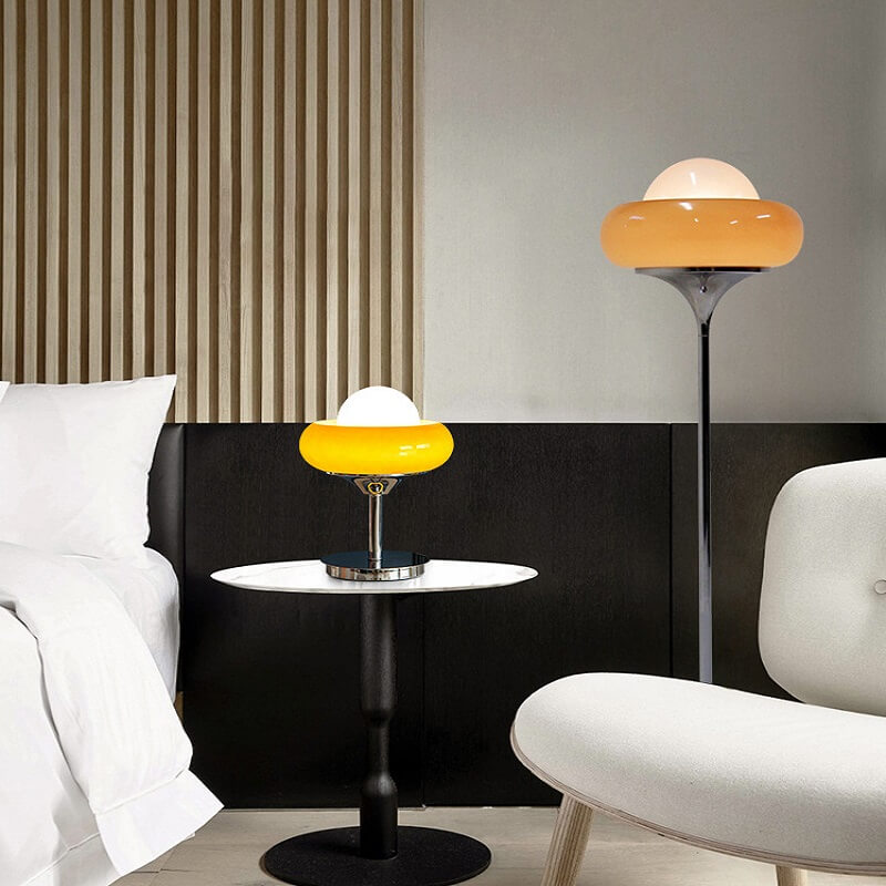 Eklektyczna minimalistyczna lampa stołowa Guzzini w kolorze pomarańczowym idealna do sypialni, salonu, gabinetu.