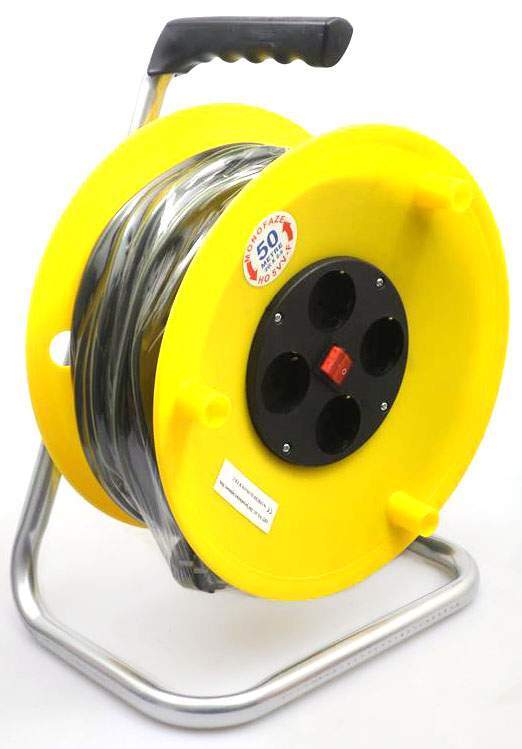 Przedłużacz bębnowy na zwijanym bębnie z metalowym stojakiem. 50-metrowy przedłużacz umożliwia podłączenie przydomowych urządzeń elektrycznych, np. odkurzacza samochodowego lub elektrycznej podkaszarki. Dzięki takiemu udogodnieniu szybko wykonasz zaplanowane prace.