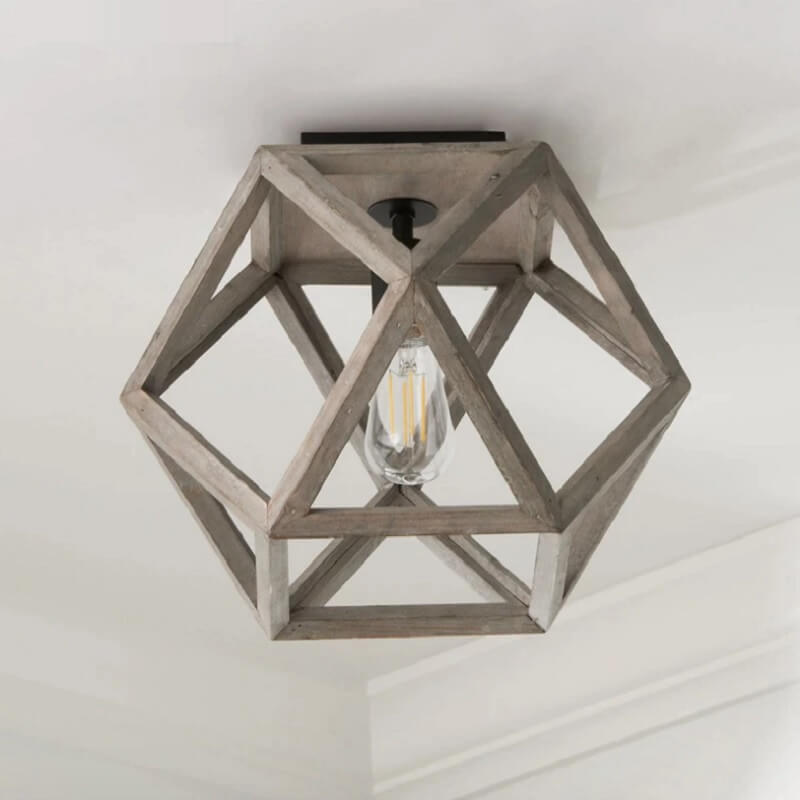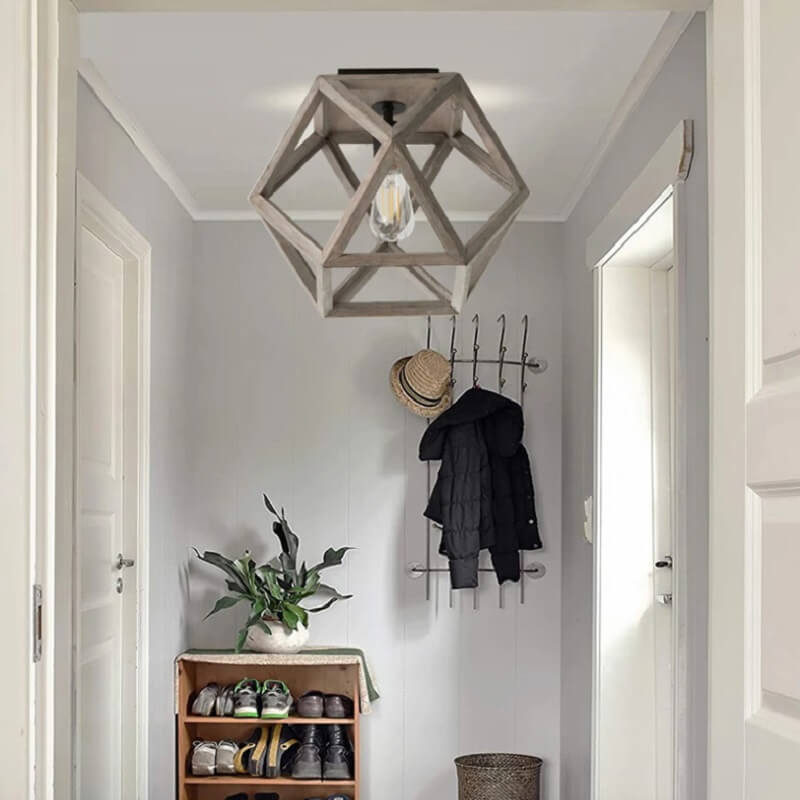 Rustykalna drewniana lampa sufitowa Denmark w kształcie klatki idealna do salonu, sypialni, kuchni, korytarza.
