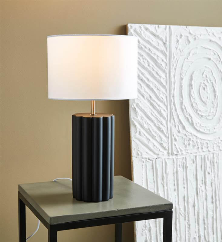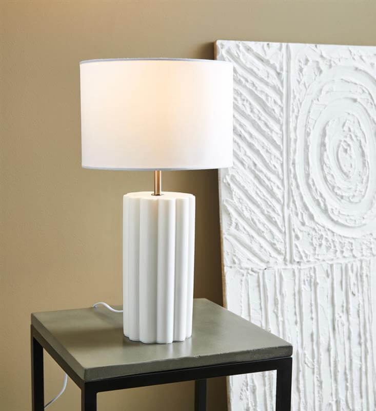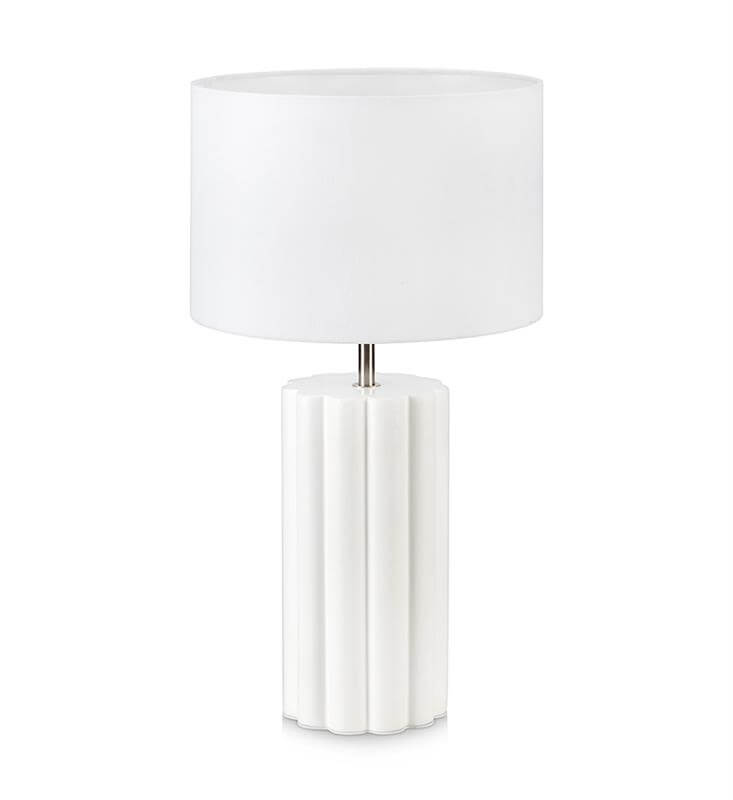 Niezwykle estetyczna lampa stołowa z białym materiałowym kloszem o średnicy 24 cm, osadzonym na eleganckiej ceramicznej kolumnie w kolorze białym lub czarnym.