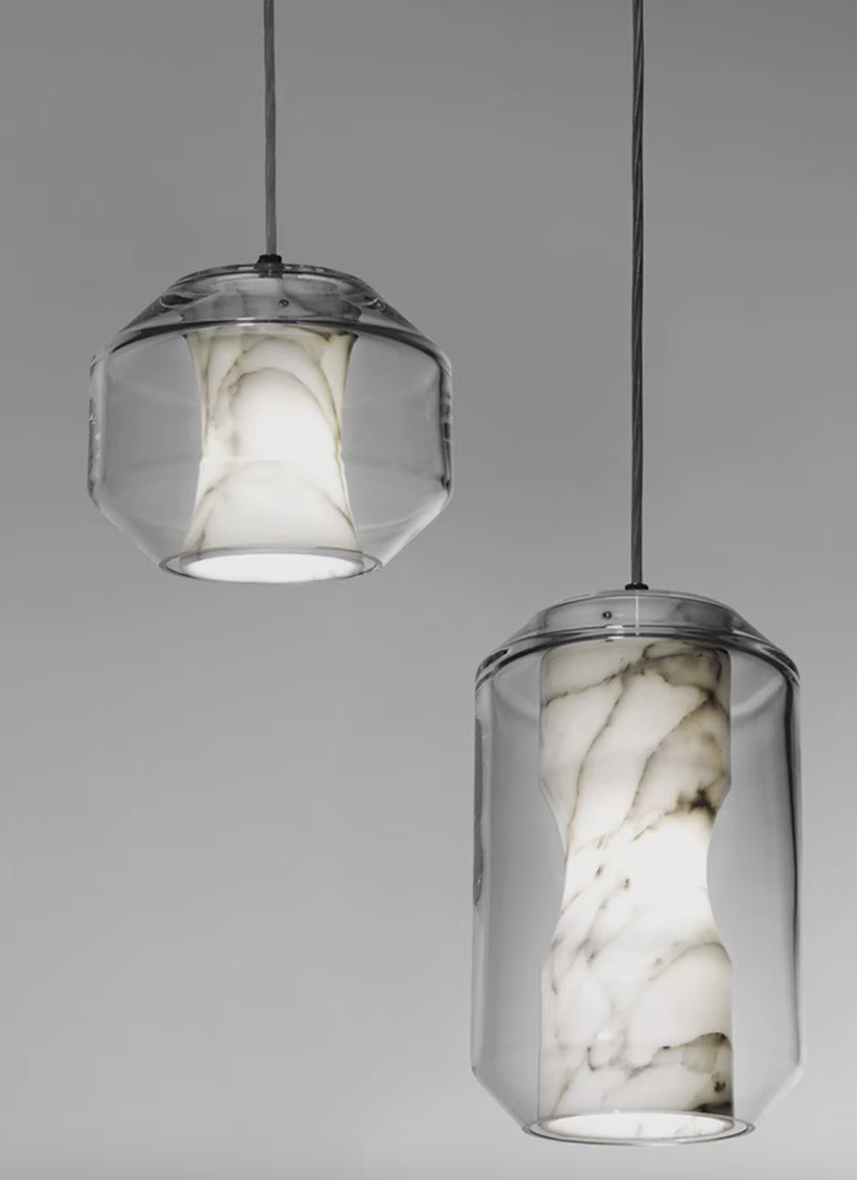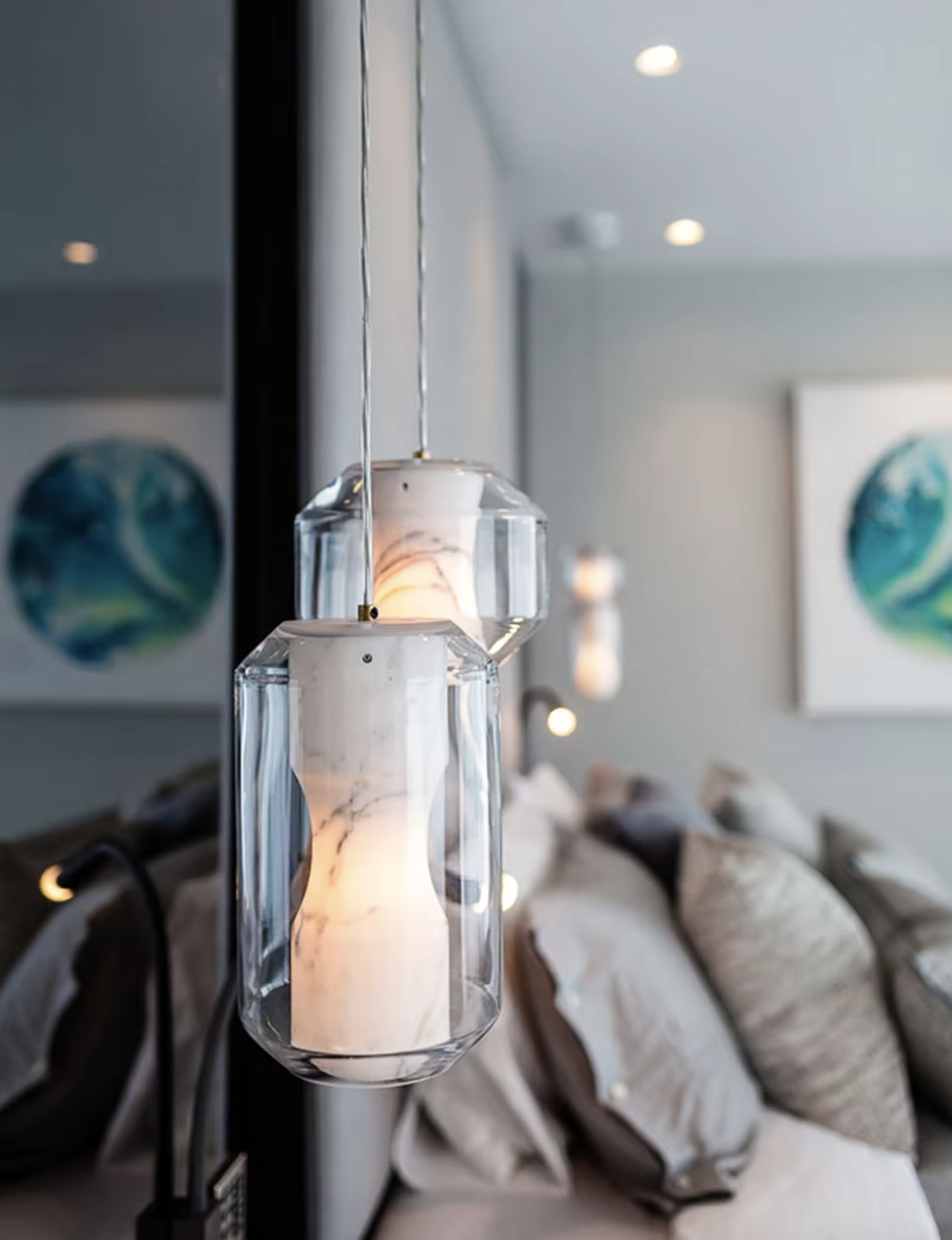 Skandynawska lampa wisząca marmur szkło. Szklany żyrandol do salonu, jadalni, holu, galerii, restauracji.