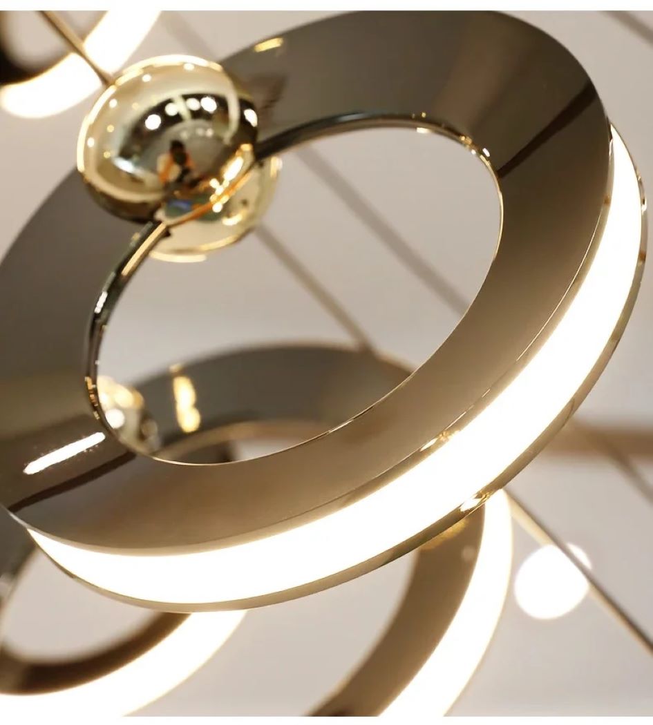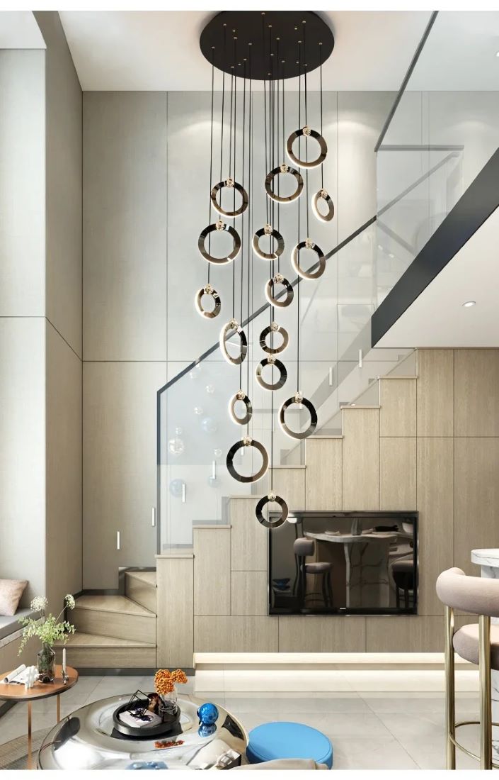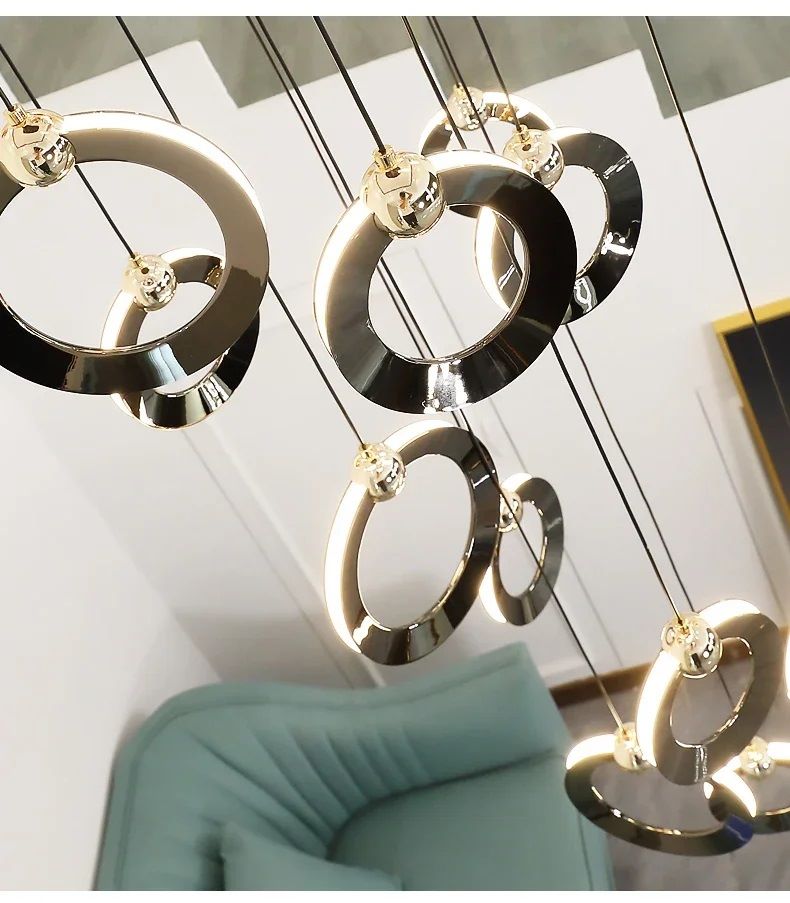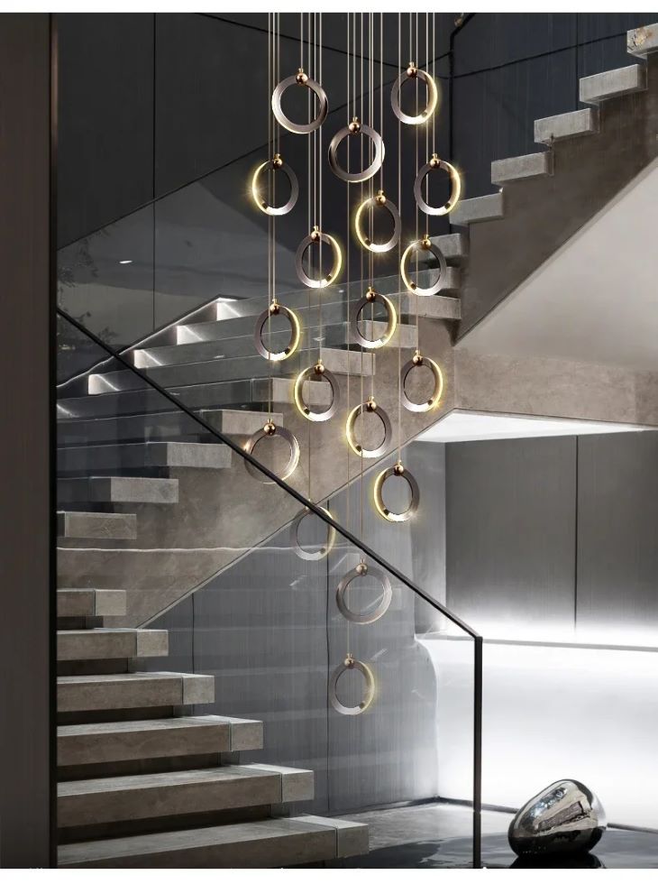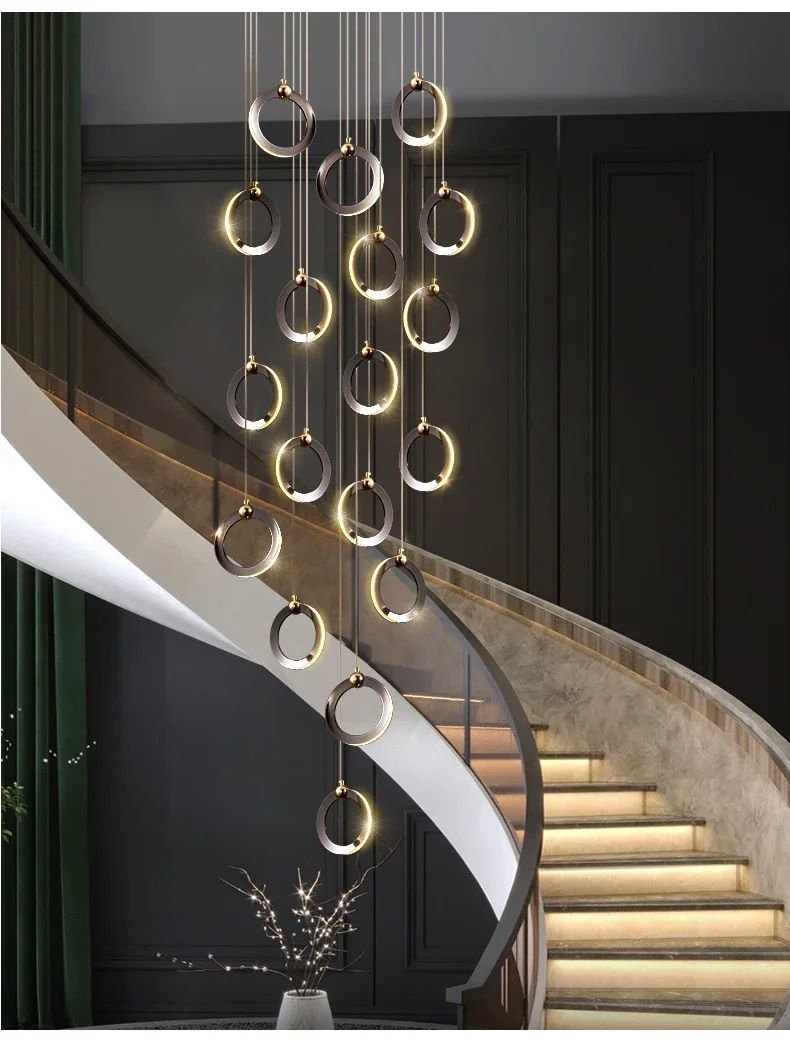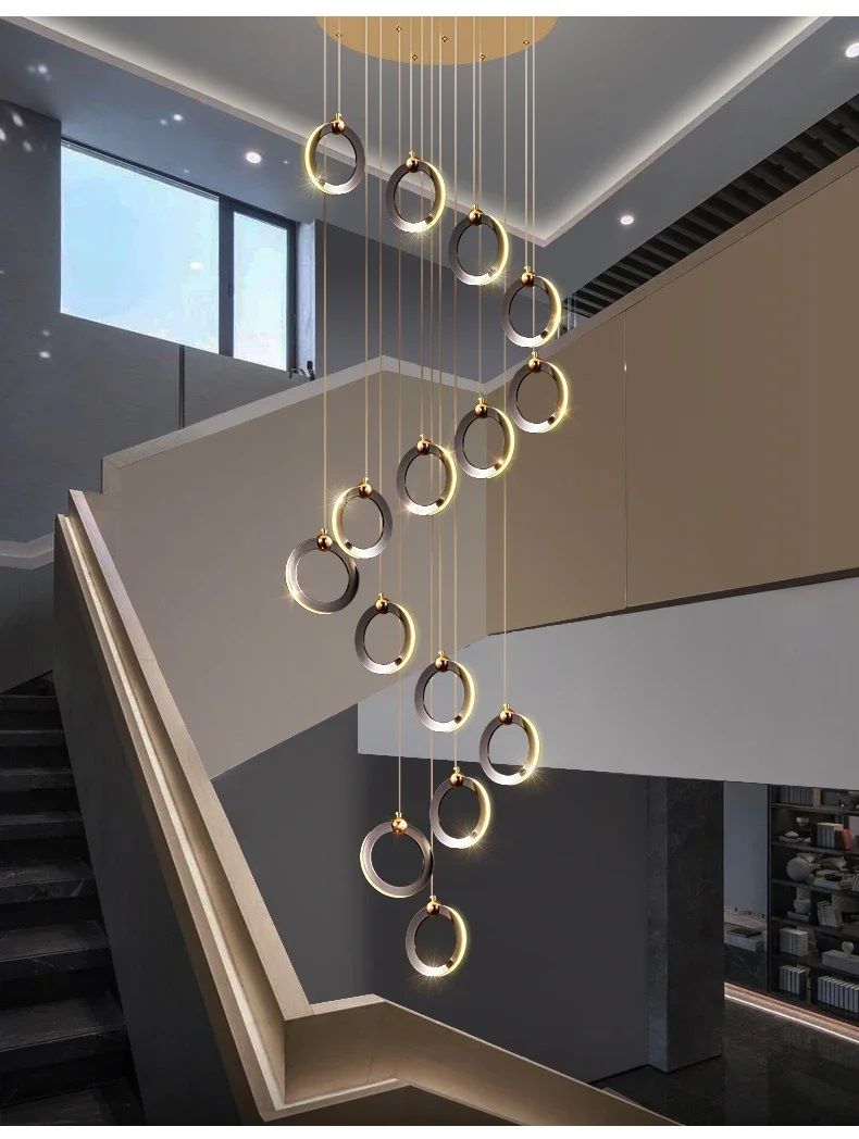 Zjawiskowa nowoczesna skandynawska lampa sufitowa Rings LED. Żyrandol na schody jak również idealny do dużego salonu czy holu.