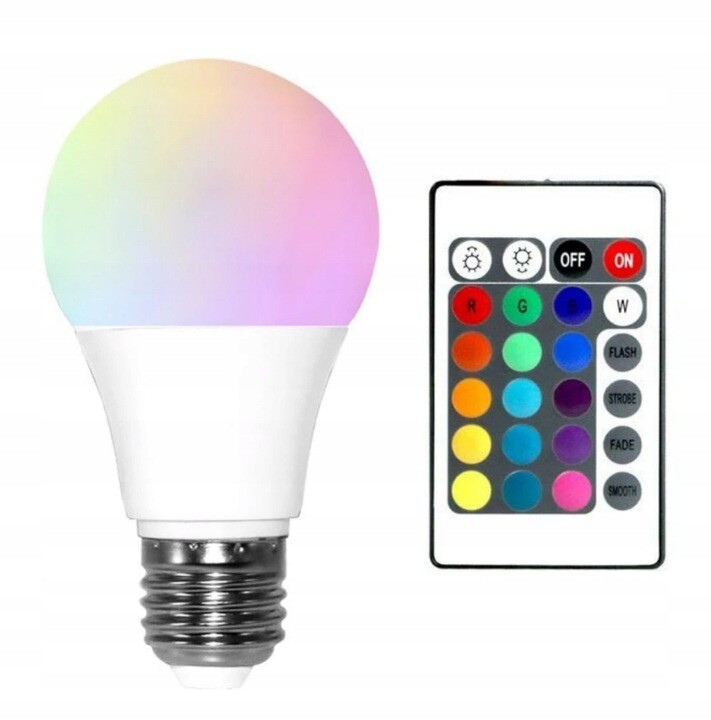 - Żarówka LED RGB E27 świeci 16 kolorami do wyboru (zgodnie z kolorami na dołączonym pilocie)