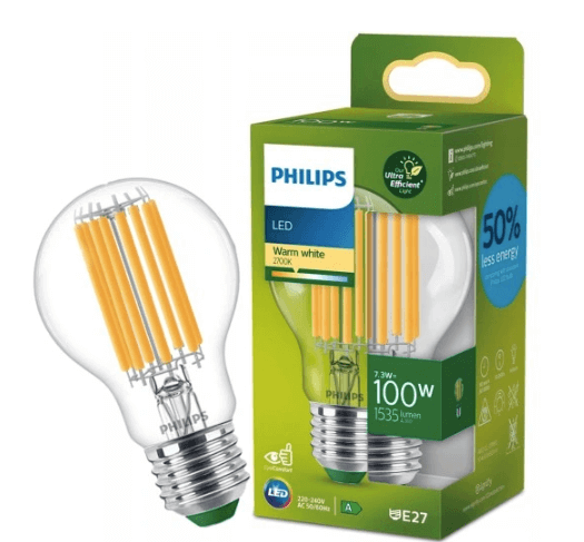 Żarówka LED E27 z serii ULTRA EFFICIENT renomowanej i uznanej w branży oświetleniowej firmy PHILIPS z trzonkiem E27, mocy 7,3W i ciepłej barwie światła. Doskonale sprawdzi się w każdym gospodarstwie domowym, a także sklepie, hotelu czy restauracji jako oświetlenie akcentowe lub dekoracyjne. Może być montowana we wszystkich tradycyjnych oprawach, które wyposażone są w trzonek E27.