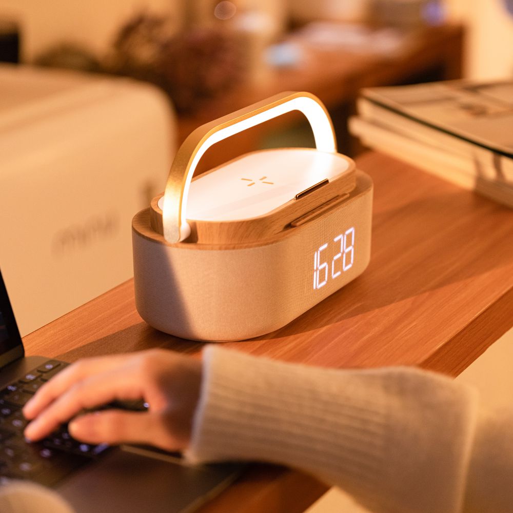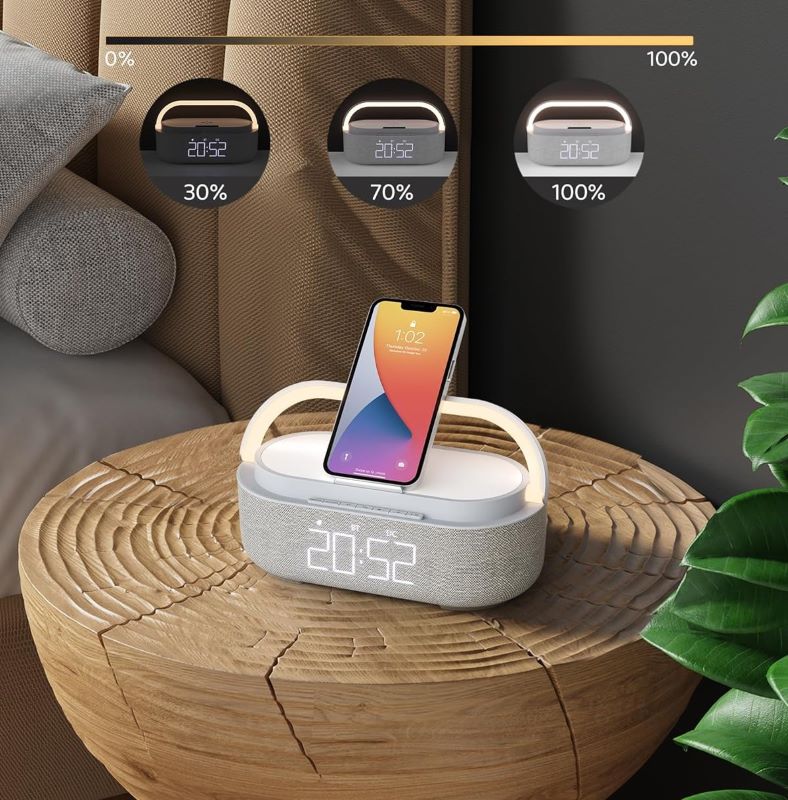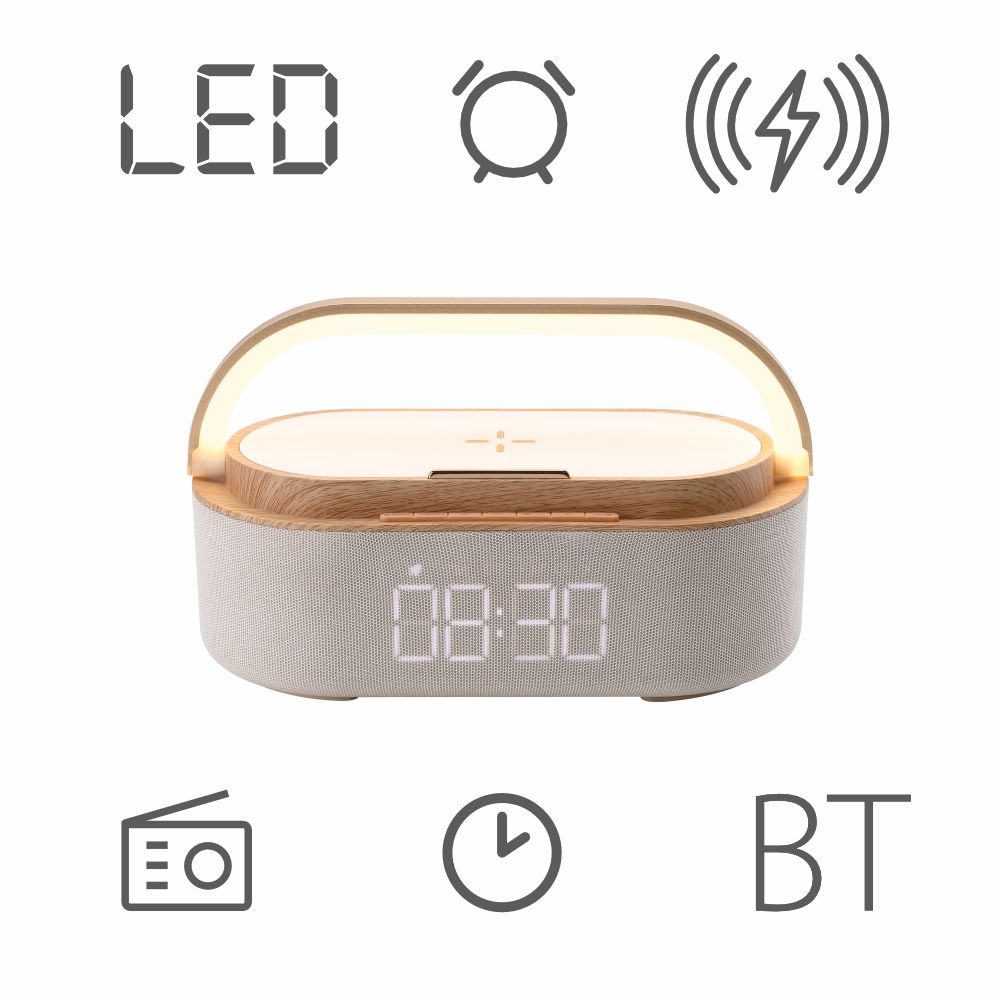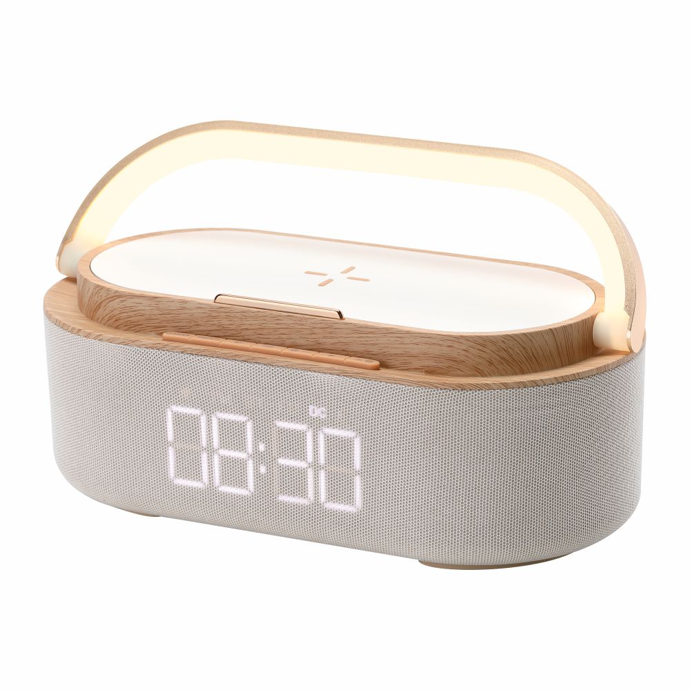 Zegar cyfrowy budzik z funkcją lampki nocnej, głośnika, podstawki pod telefon i bezprzewodowej ładowarki w kolorze drewnianym i szarym