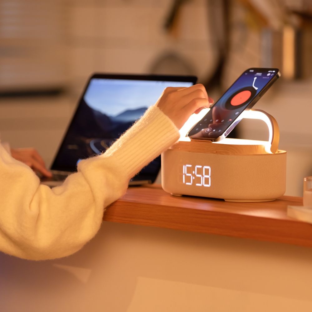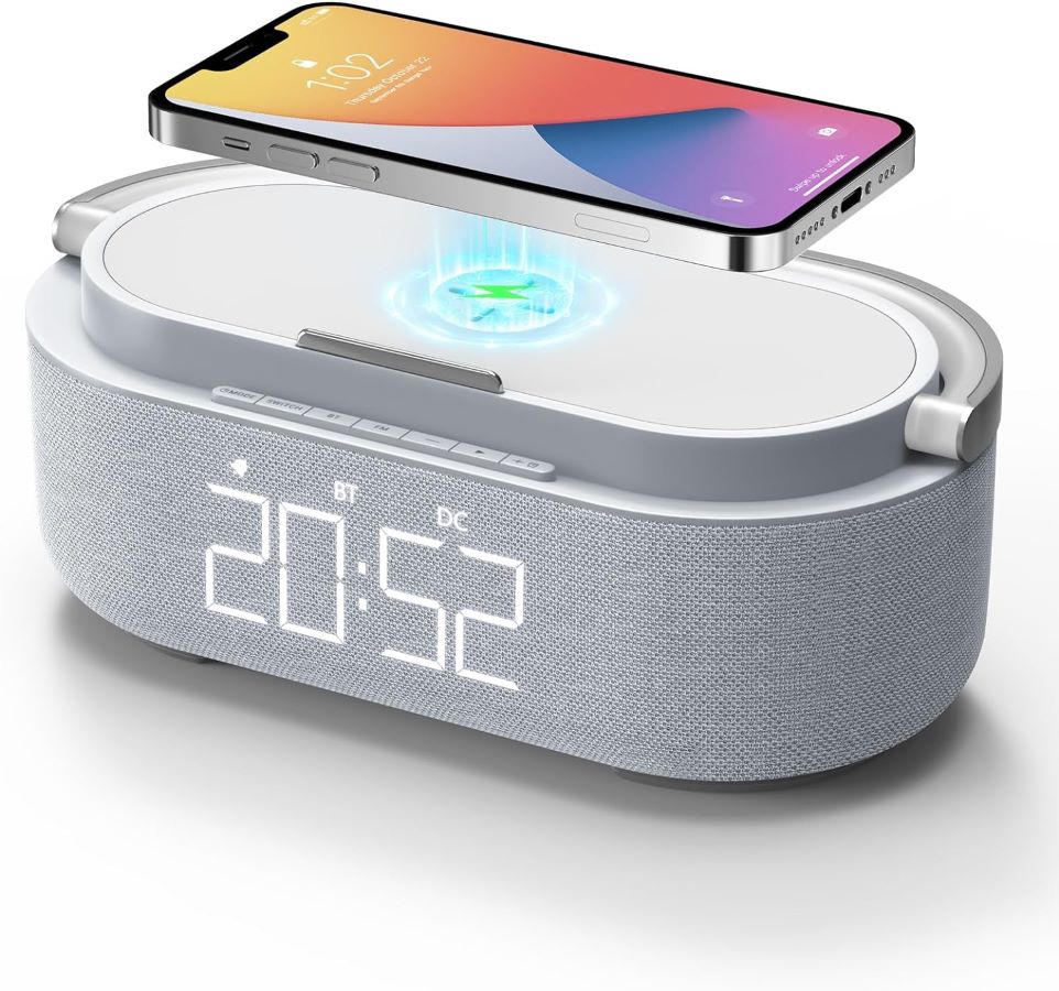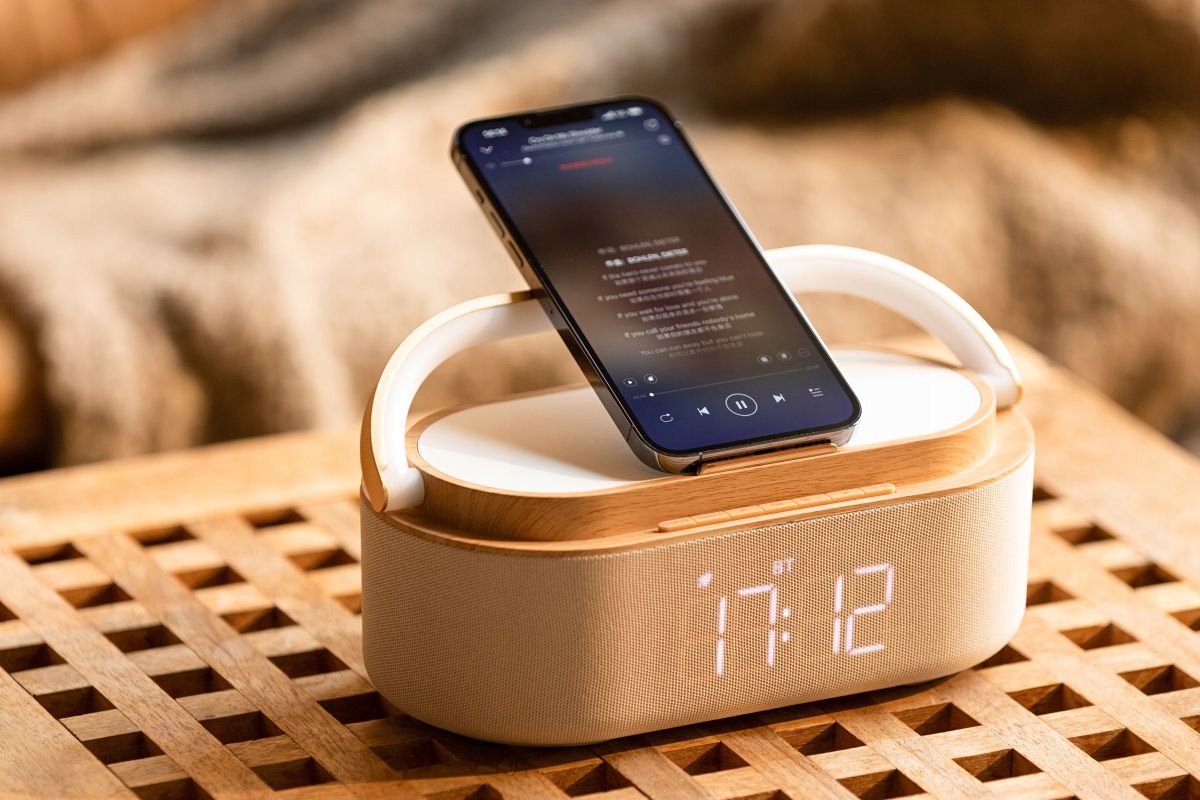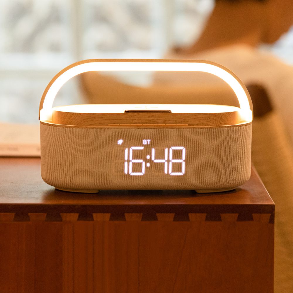 Zegar cyfrowy budzik z funkcją lampki nocnej, głośnika, podstawki pod telefon i bezprzewodowej ładowarki w kolorze drewnianym i szarym