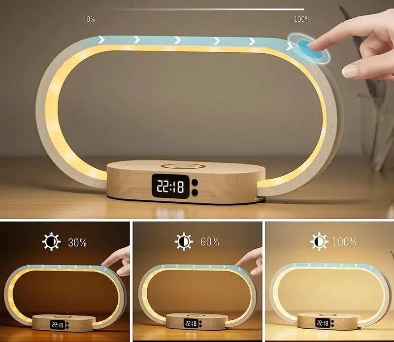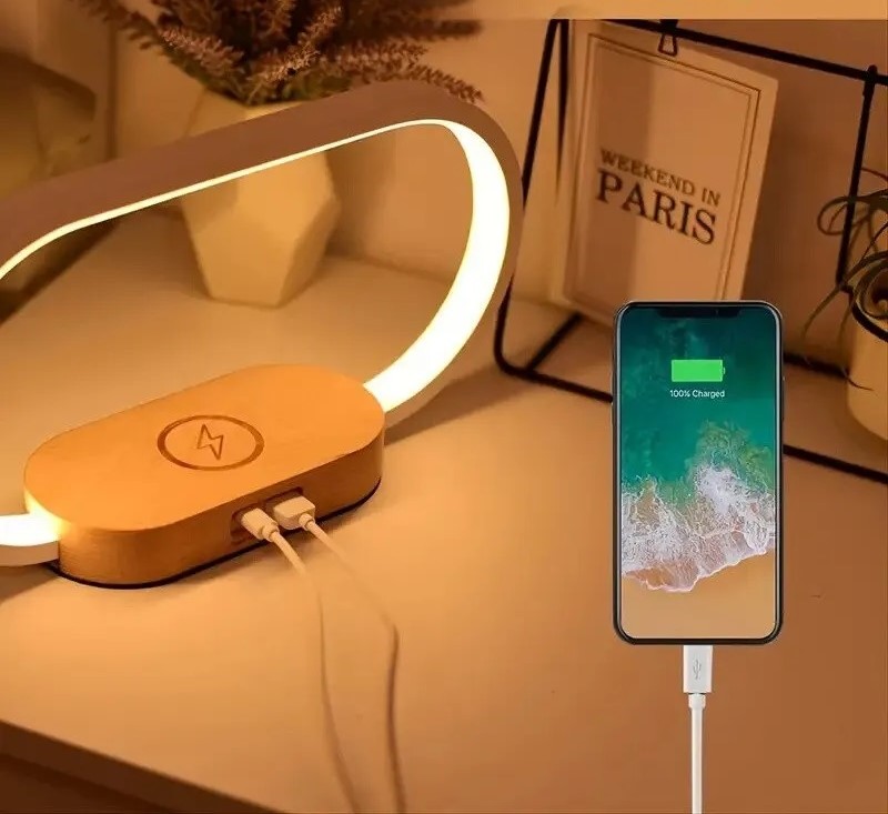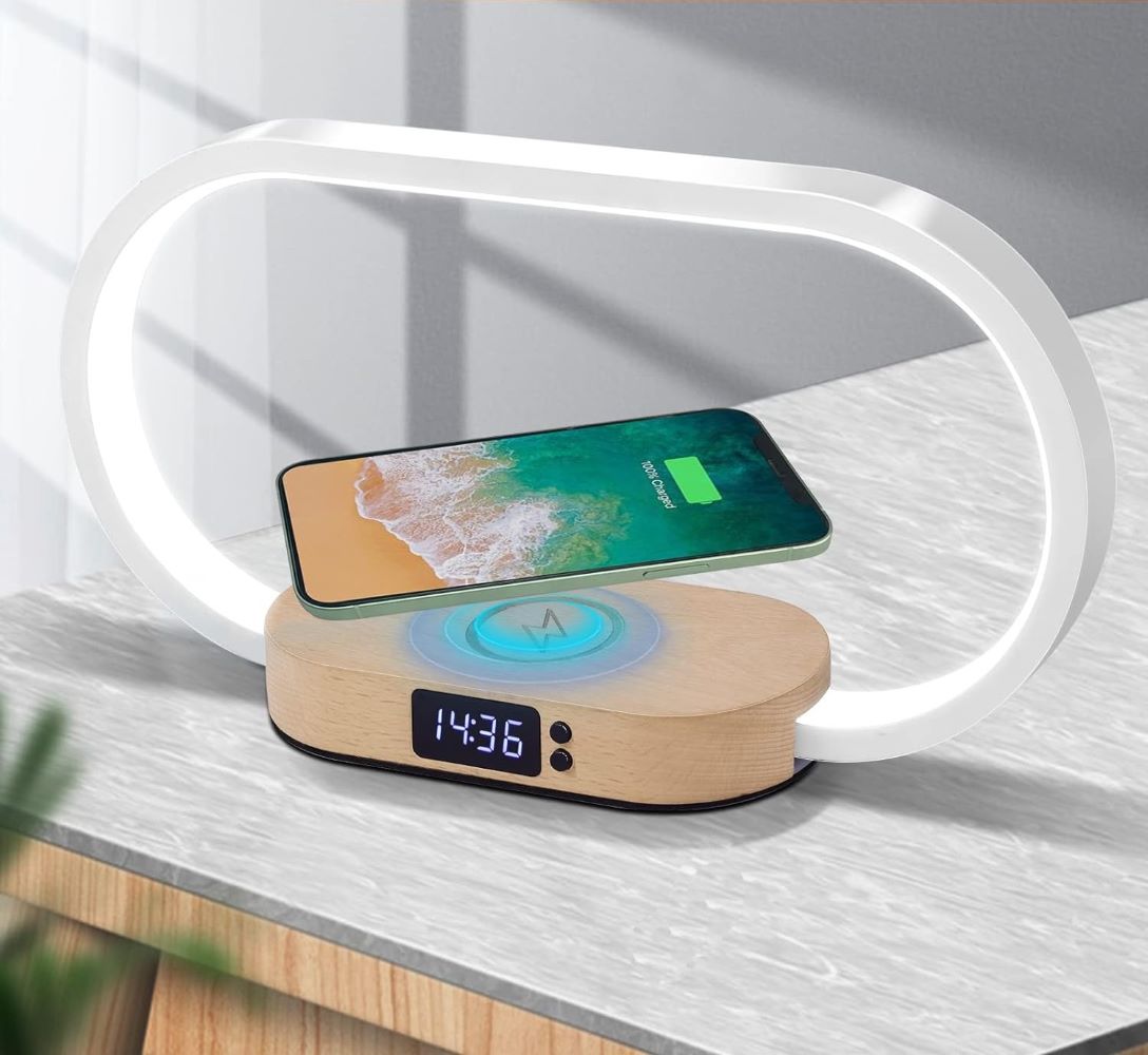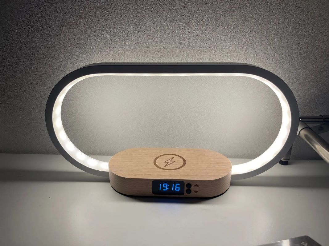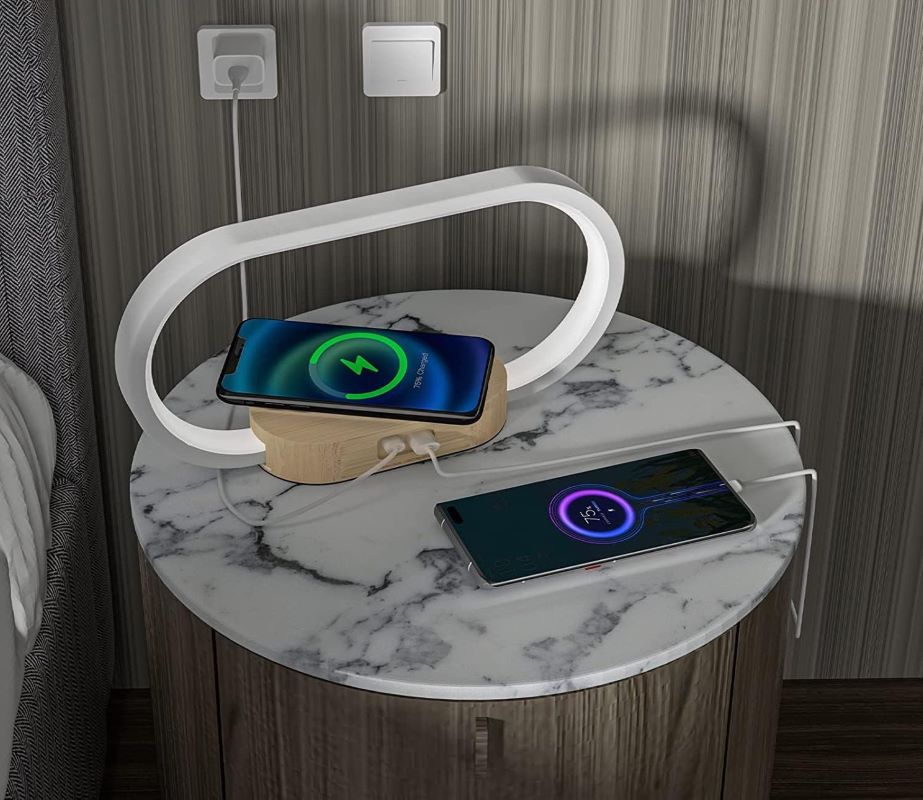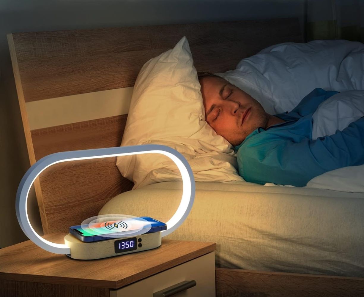 - Lampka nocna, budzik, pomoc w zasypianiu, bezprzewodowa ładowarka, ładowarka portem USB.