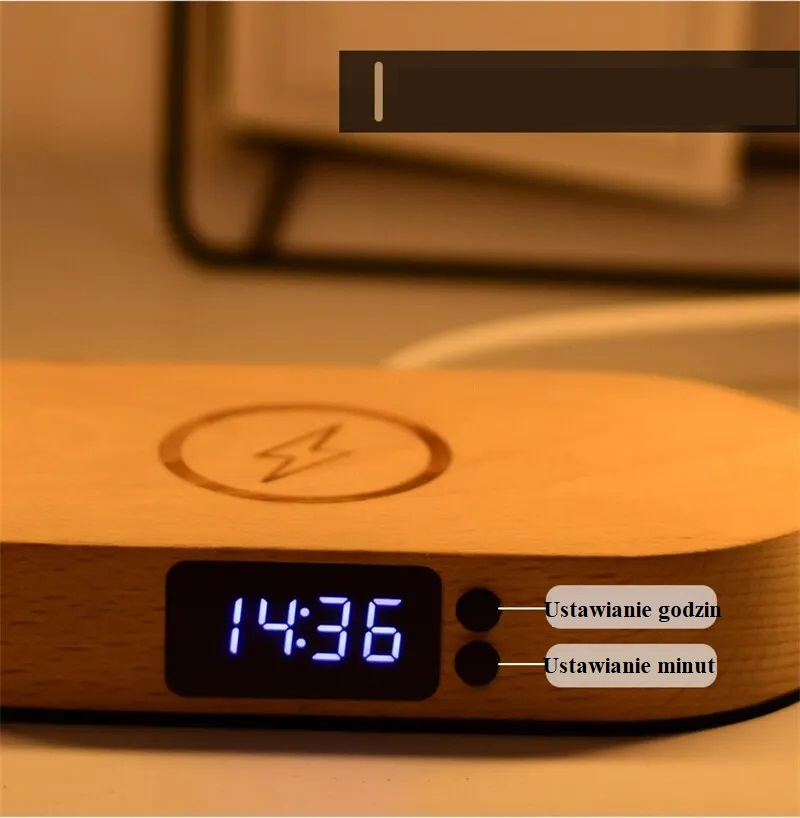 Zegar Budzik Lampka Nocna Bezprzewodowa Ładowarka Wood Biała