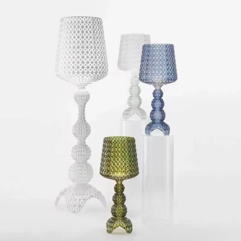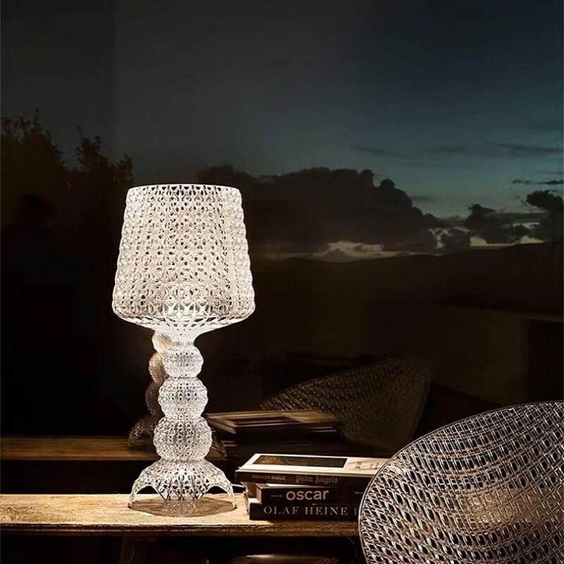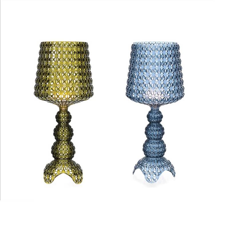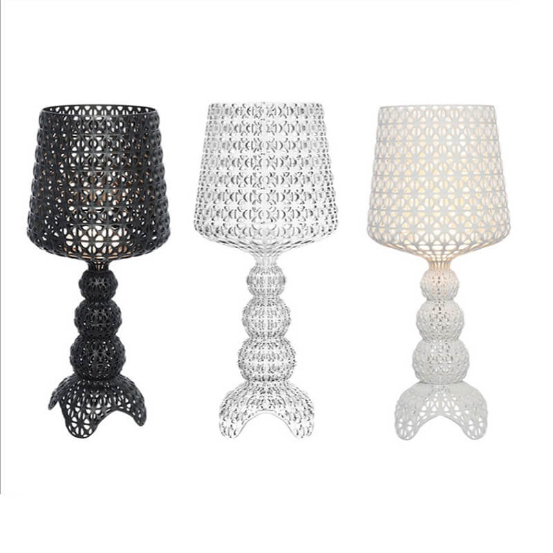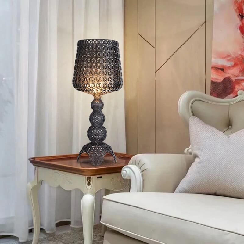 Lampa stołowa Kabuki nawiązuje do stylu neobarokowego i powstała w wykorzystaniu nowoczesnych technik wtryskowych. Dzięki temu możliwe było uzyskanie teksturowanej, ażurowej powierzchni – plastikowej koronki, która pięknie rozprasza światło. Dodatkową funkcją lampy jest możliwość regulacji natężenia światła.
