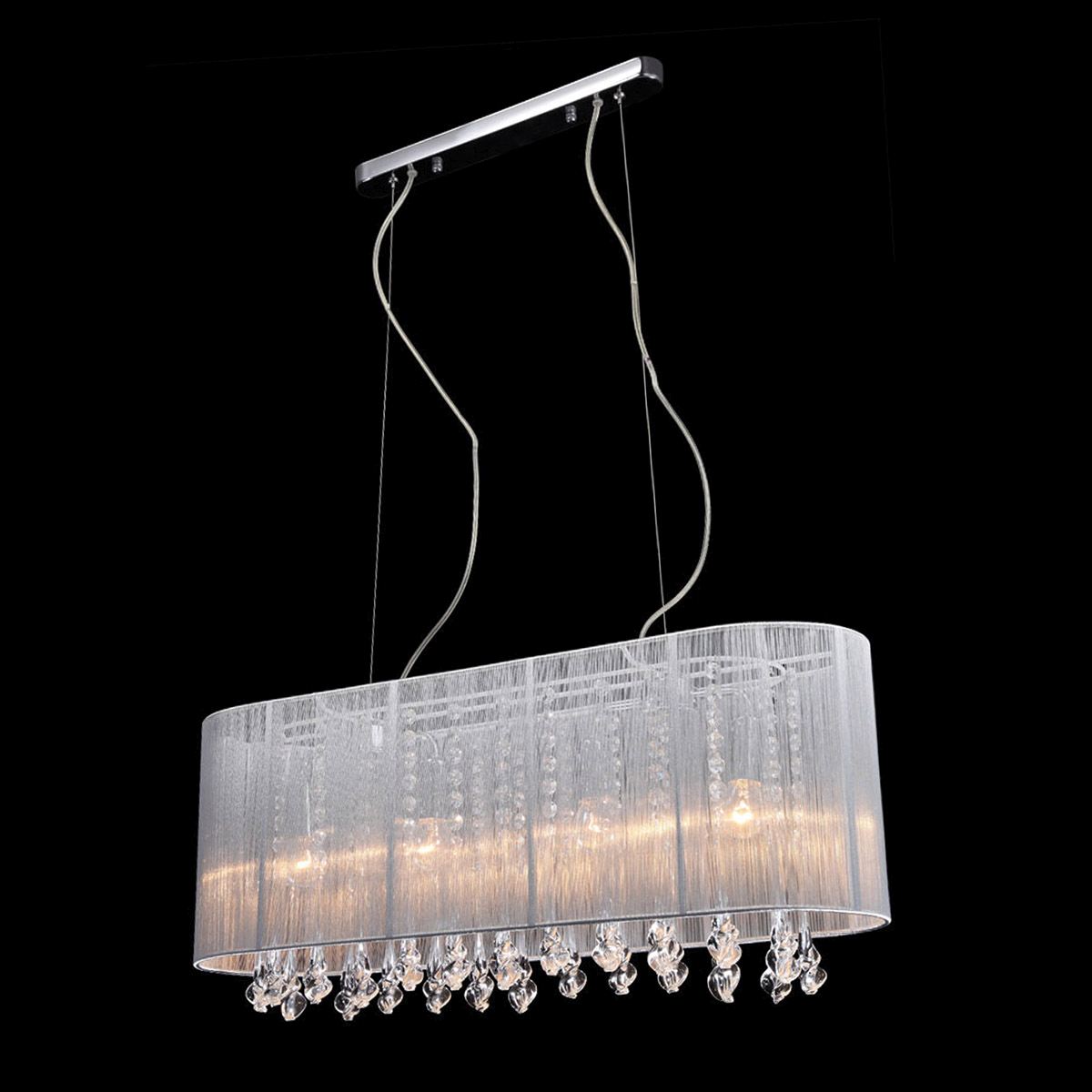 Ozdobna lampa wisząca wyróżnia się wyjątkowym tekstylnym abażurem w stylu glamour. Abażur wykonany jest z cienkiej tkaniny oplecionej wokół jego stelażu. Tkanina jest delikatna, przez co ładnie przepuszcza światło, jednak kryje miejsce mocowania żarówek. Dodatkowego uroku dodają kryształy, które wyłaniają się z wnętrza oprawy. Jest to elegancka propozycja do salonów, sypialni, restauracji czy hoteli. Wykonanie wysokiej jakości opraw zapewni nam ekskluzywny element każdego wnętrza. Elementy metalowe wykończone w chromie.